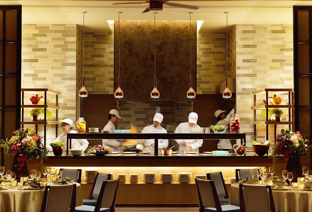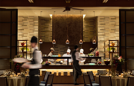 臨場感あふれるオープンキッチンから漂う音と香りが料理への期待を高め、壁一面に設置された大型ソファが居心地の良さを演出。