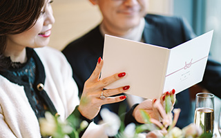 当日の進行、お料理メニューなどをご紹介する”しおり”をご用意いたします。おふたりで作成するお手間を取らせず、全面サポートいたしますのでご安心ください。