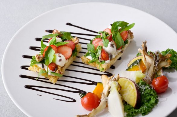 季節の野菜 オープンサンドでは、いちご・バルサミコ・チョコレートを使用した見た目も鮮やかなひとしなをご用意。