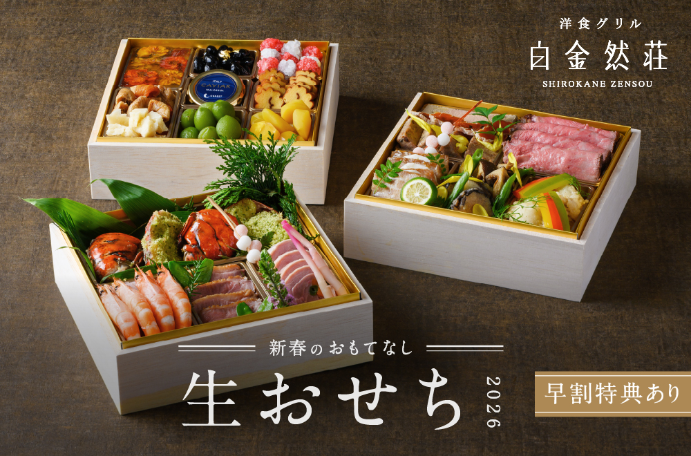 白金然荘では、讃岐オリーブ牛のローストビーフなど、和洋折衷の多彩な品々を盛り込んだ贅沢三段重をご用意しました。