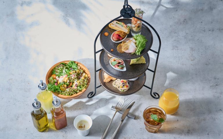 3段スタンドのなかには、焼きたてのフランス産発酵バターを使用したクロワッサンが食べ放題をはじめ、季節のフルーツや野菜を使用したポーション10種お楽しみいただけます。