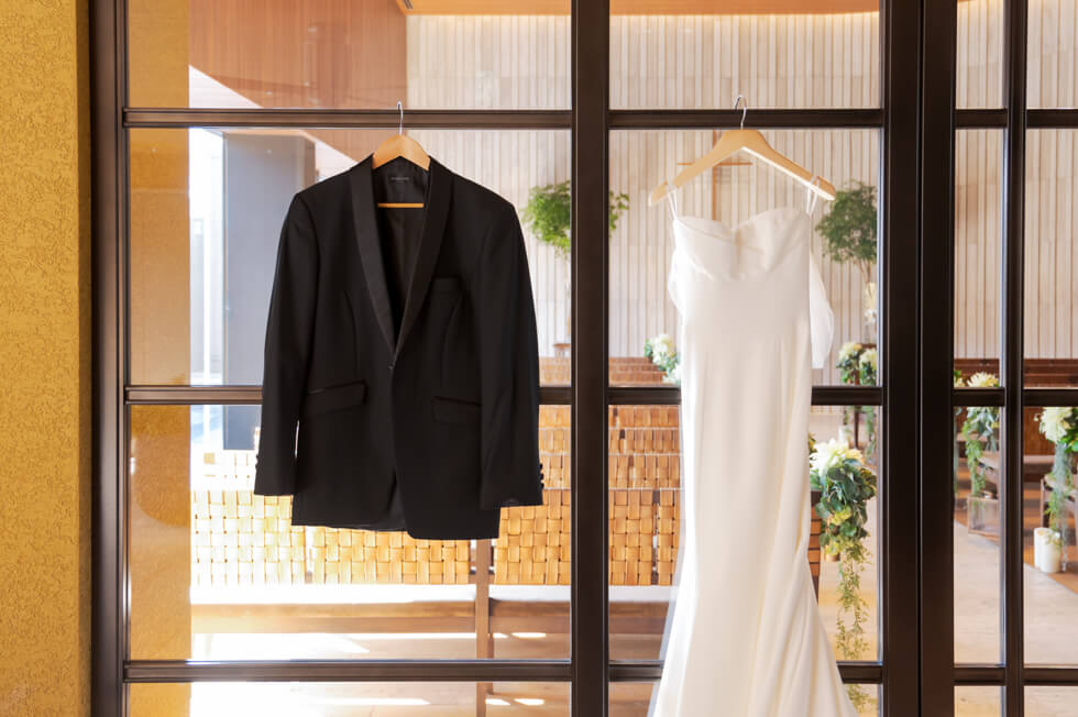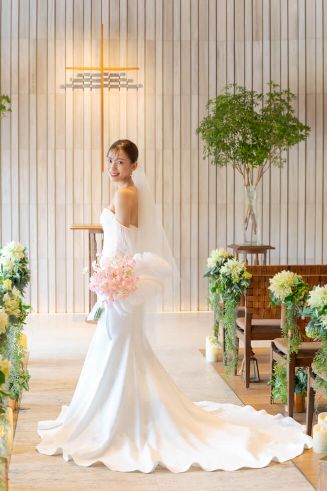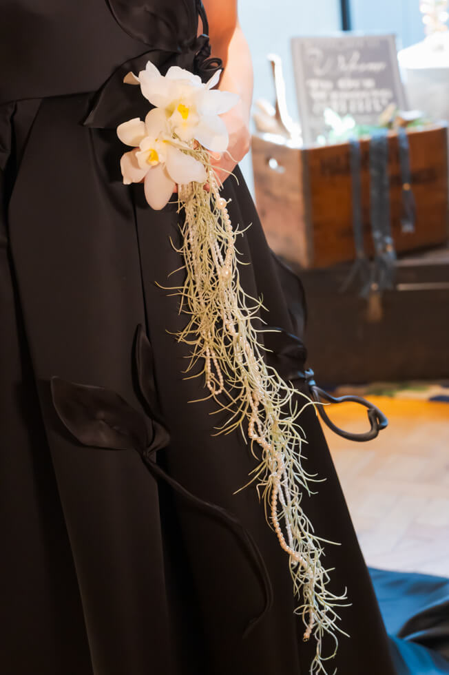 専属のフラワーデコレーターとの打ち合わせでドレスを迷っていた際に、このブラックドレスに合わせて、ご新婦様とドレスがより美しく映えるデザインを提案。立体的なブラックドレスに対して真っ白なシンビジュームを使用した控えめなハンドレットブーケをスパニッシュモスとパールを加えることで存在感のあるデザインとなりました。