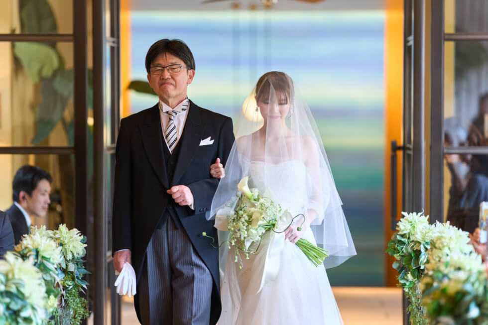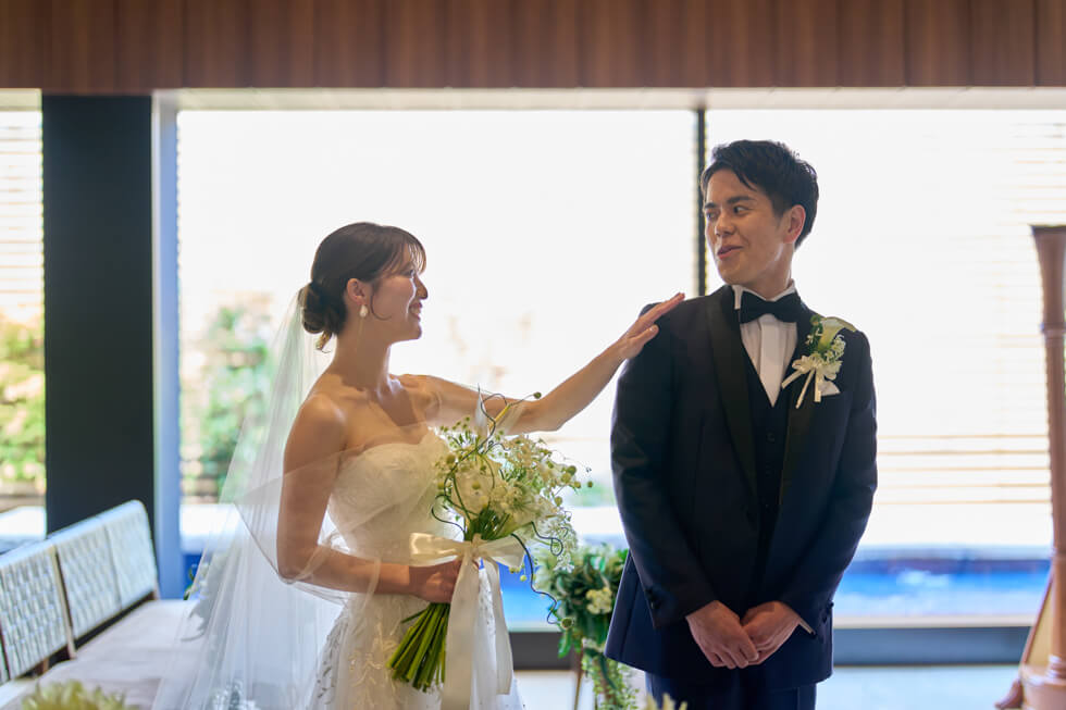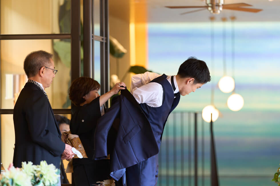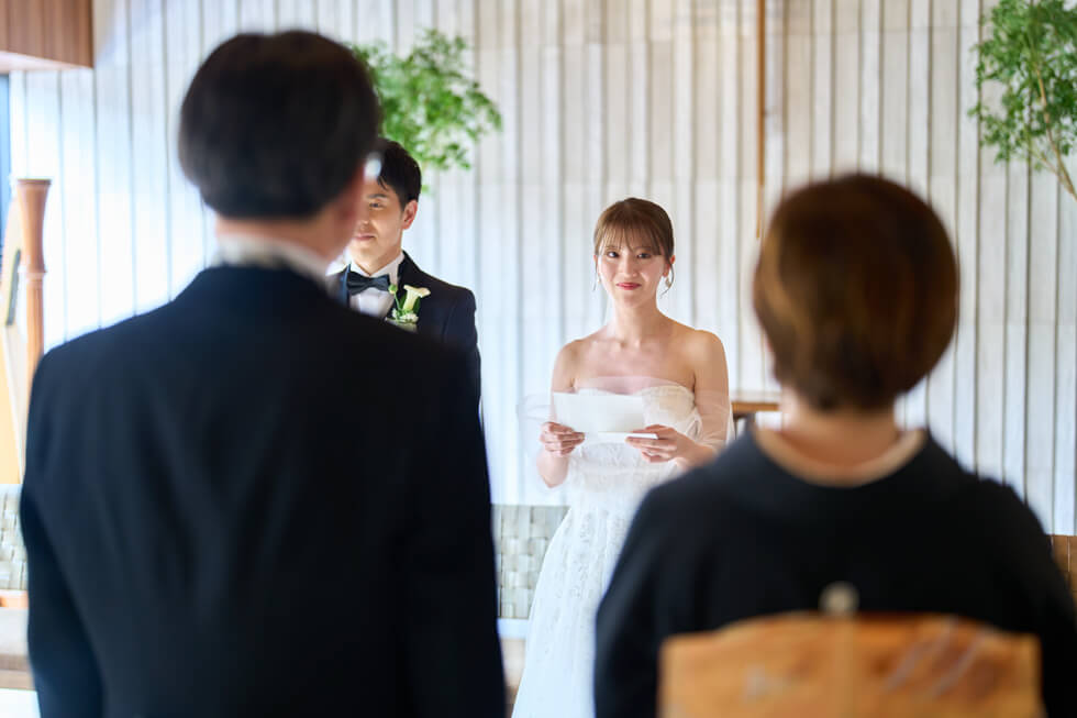 人前式では、大切な親御様からのジャケットセレモニー・ベールダウンに加え、誓いの言葉は両家お母様からの問いかけスタイルを取り入れました。誓いの言葉では、おふたりの幼少期の記憶を思い出しながら、未来へつながる誓いを問いかけていただきました。