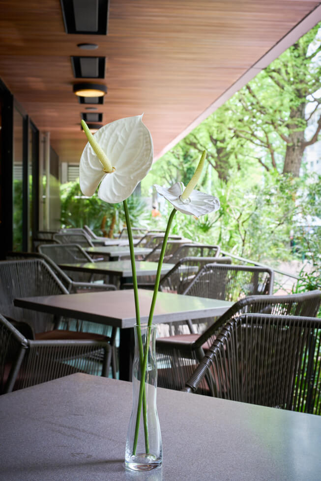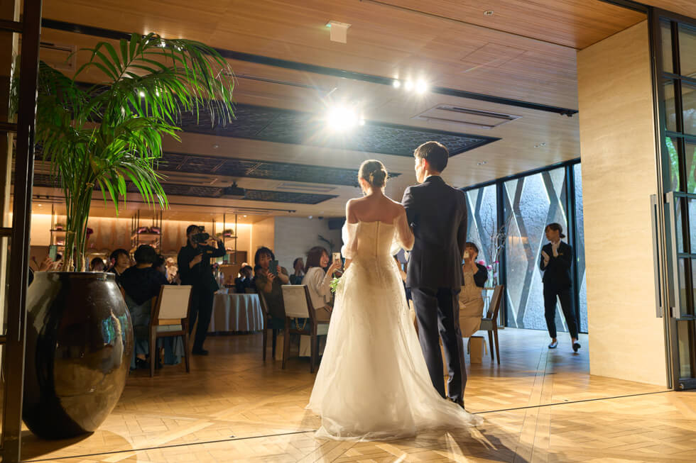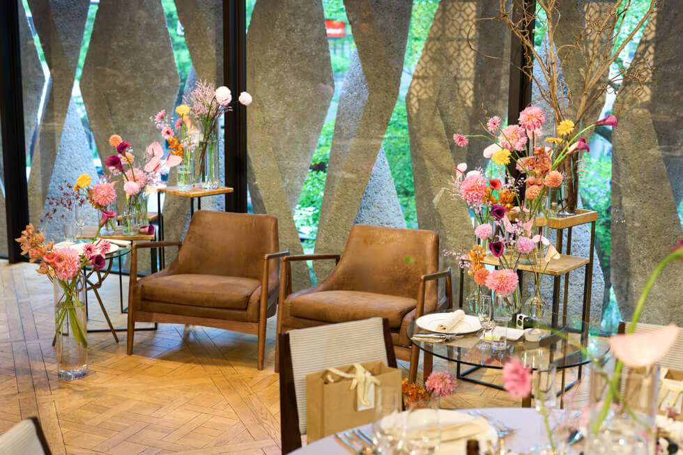 披露宴では、2階インディゴ リオスにてゲストとの距離近く、日常の延長のようなラフな雰囲気のパーティーに。ゲスト参加型の演出や友人インタビューを加え、集まった皆様にお互いのゲストを知っていただくお時間をつくりました。