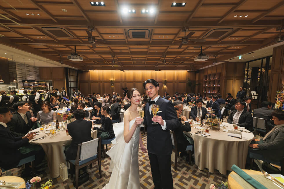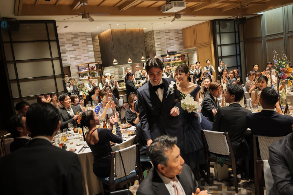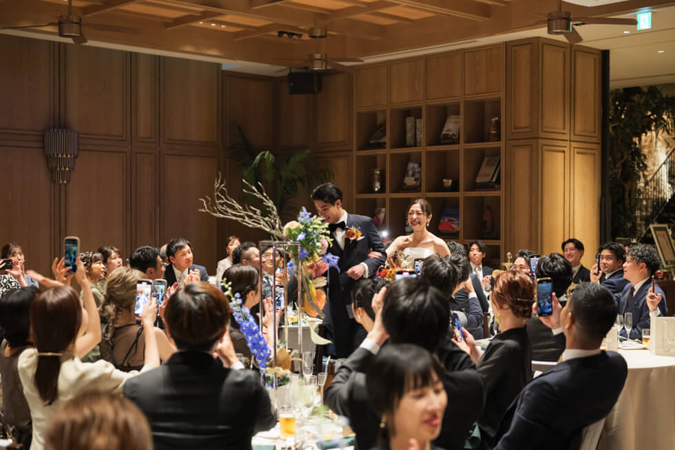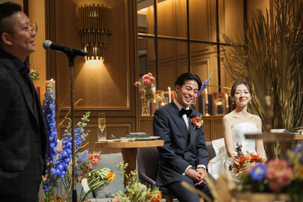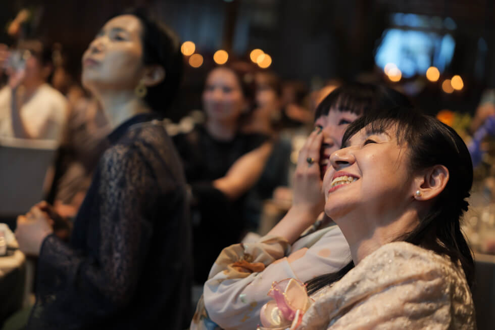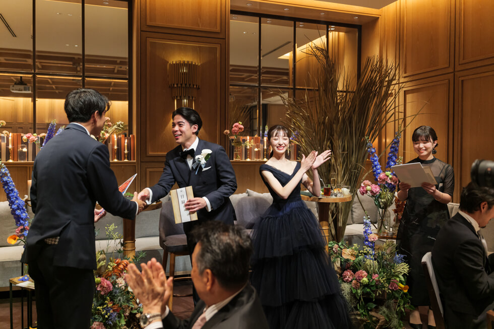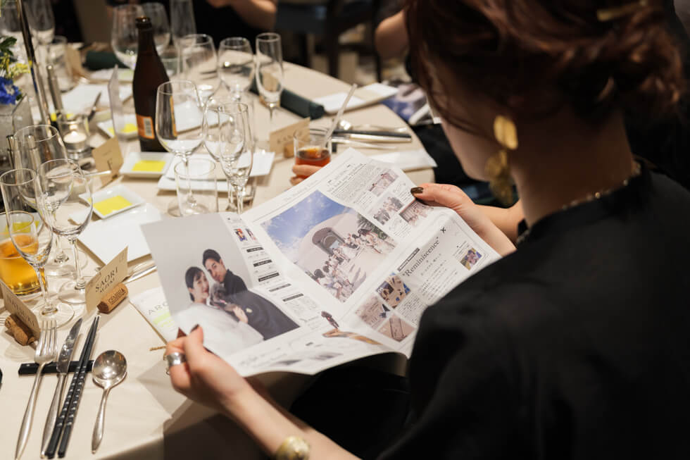 再入場後のテーブルラウンドでは、ゲストお一人おひとりにお手紙をお渡し。その場では封を開けず、新郎新婦の退場後の「オープンレターセレモニー」にて一斉にお手紙を読んでいただく演出に。それぞれの想い出を懐かしむ、過去の記憶から未来へつながるお時間になりました。