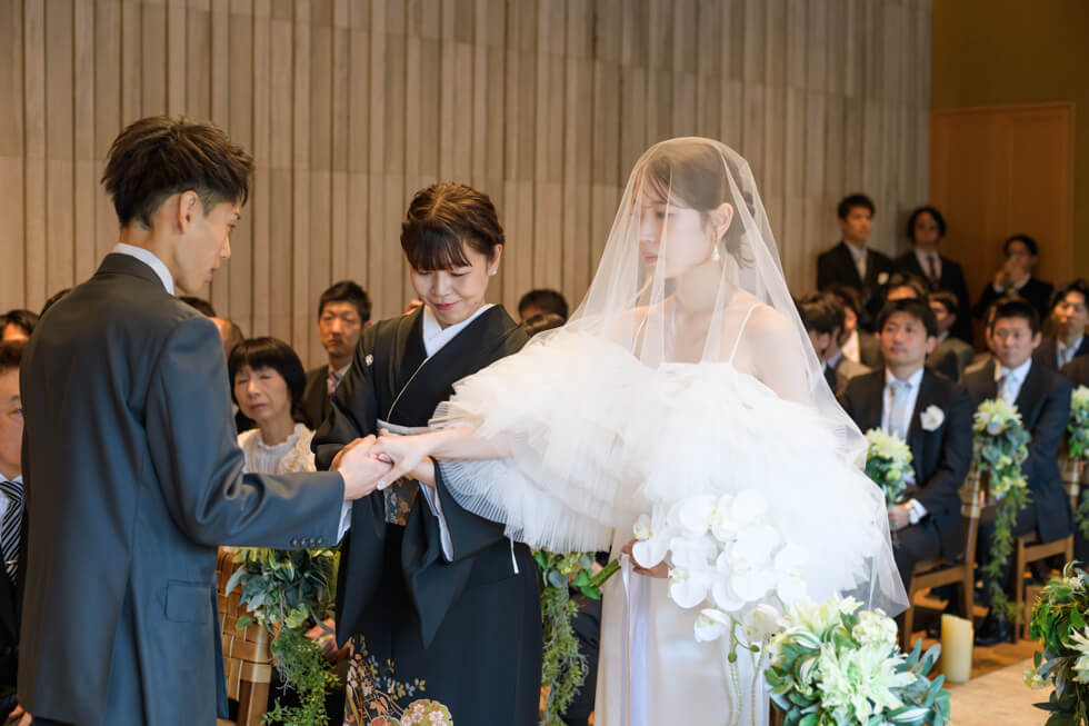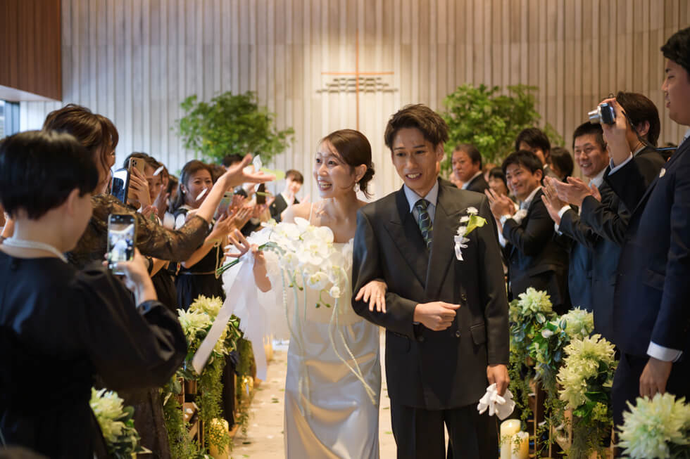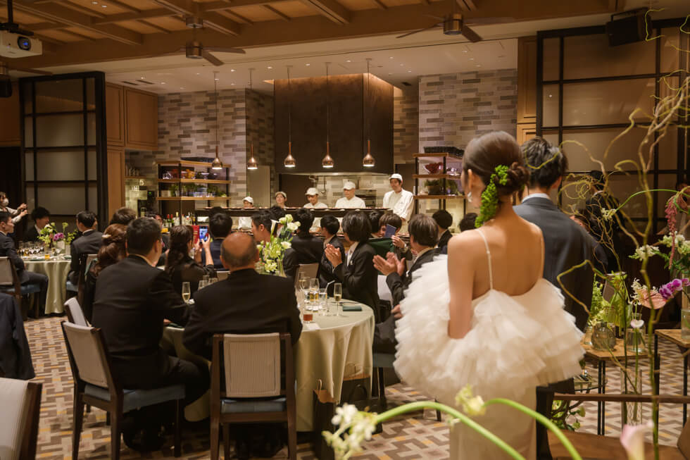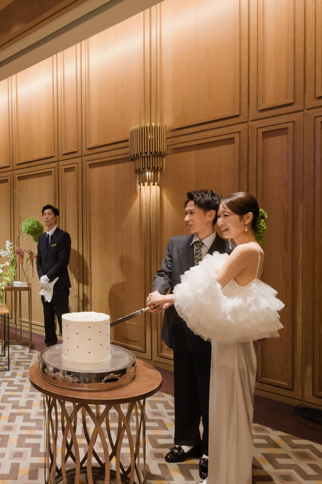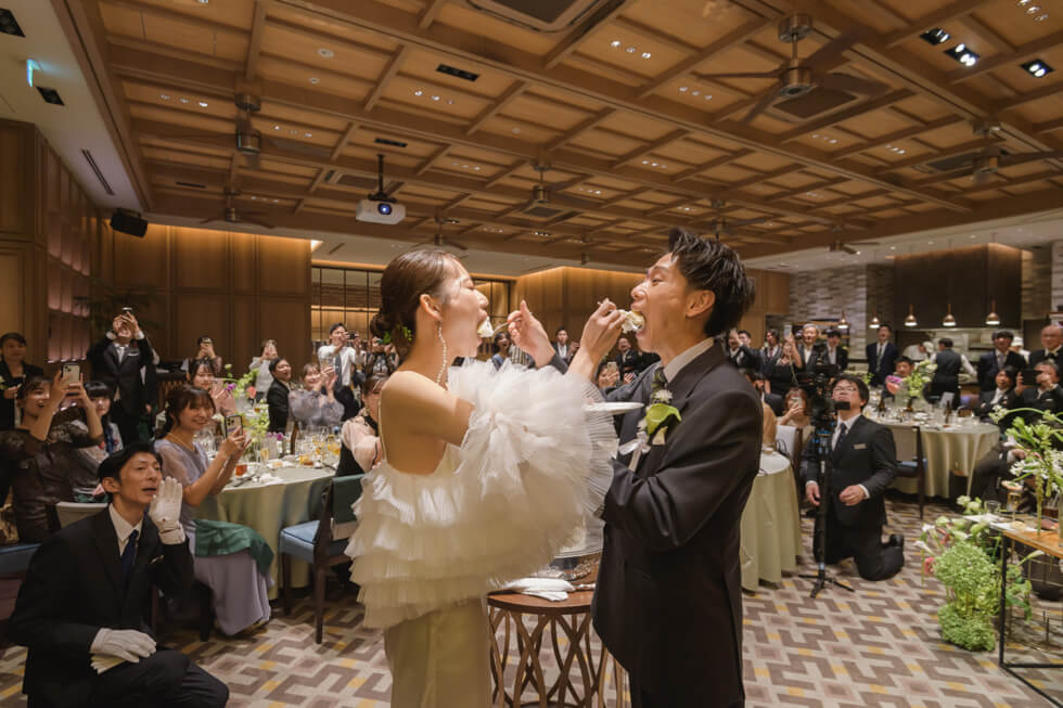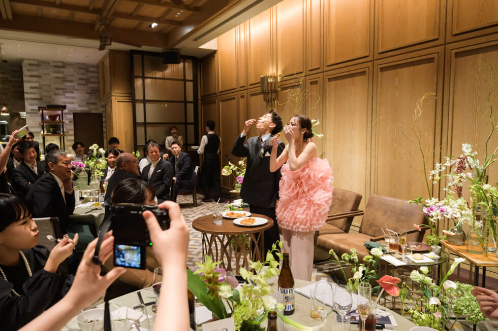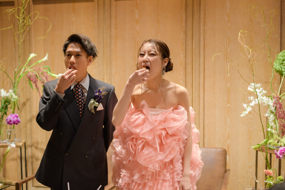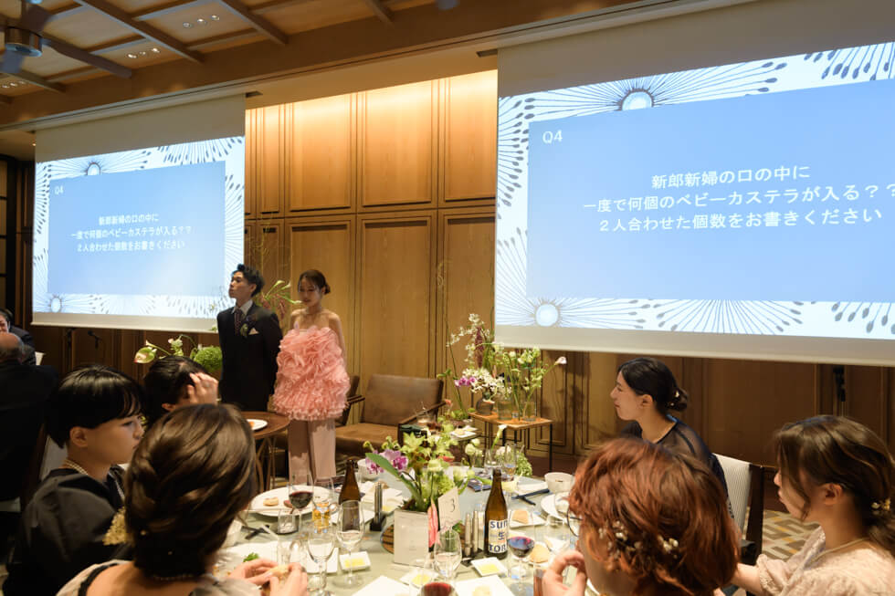 その後の披露宴で盛り上がった演出は「新郎新婦クイズ」。「新郎新婦の口にベビーカステラが何個入るか?」という問題では、新郎新婦が実際にベビーカステラを口に入れて答え合わせ。「もう1個!」とゲストの応援で盛り上がりました。