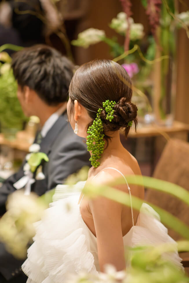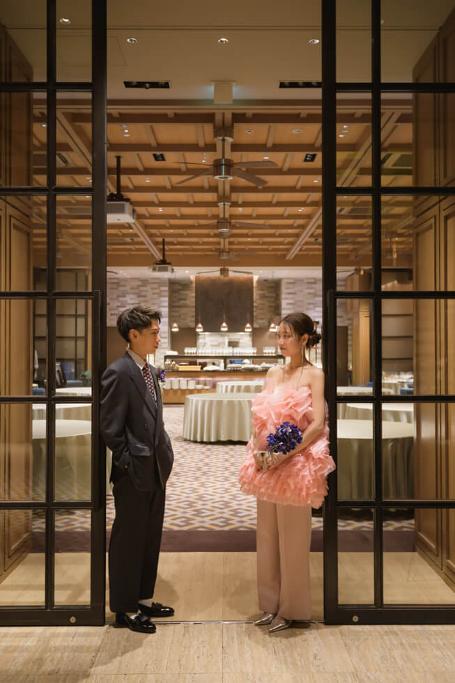 ご新婦様がお色直しで選ばれたドレスは、新作のパンツスタイルドレス。スタイリッシュでありながら、ピンクの立体的なフリルのデザインが甘い印象も与えます。