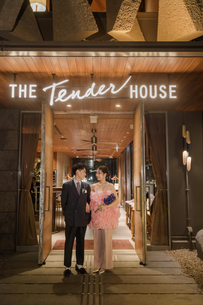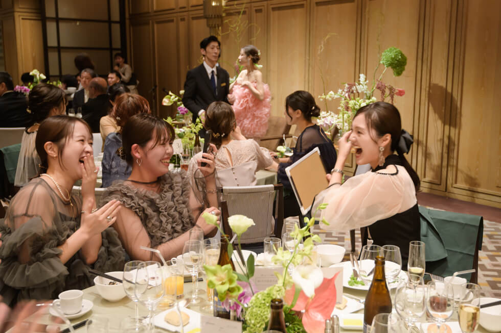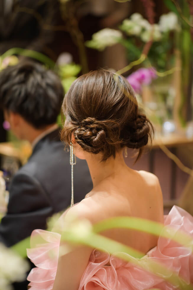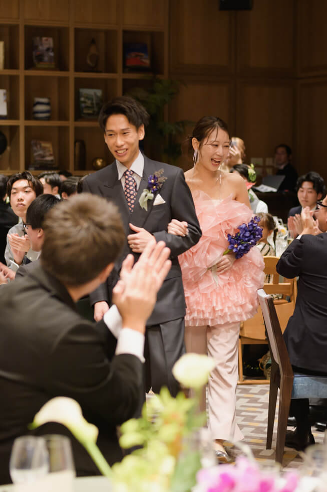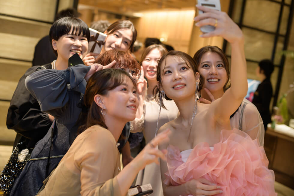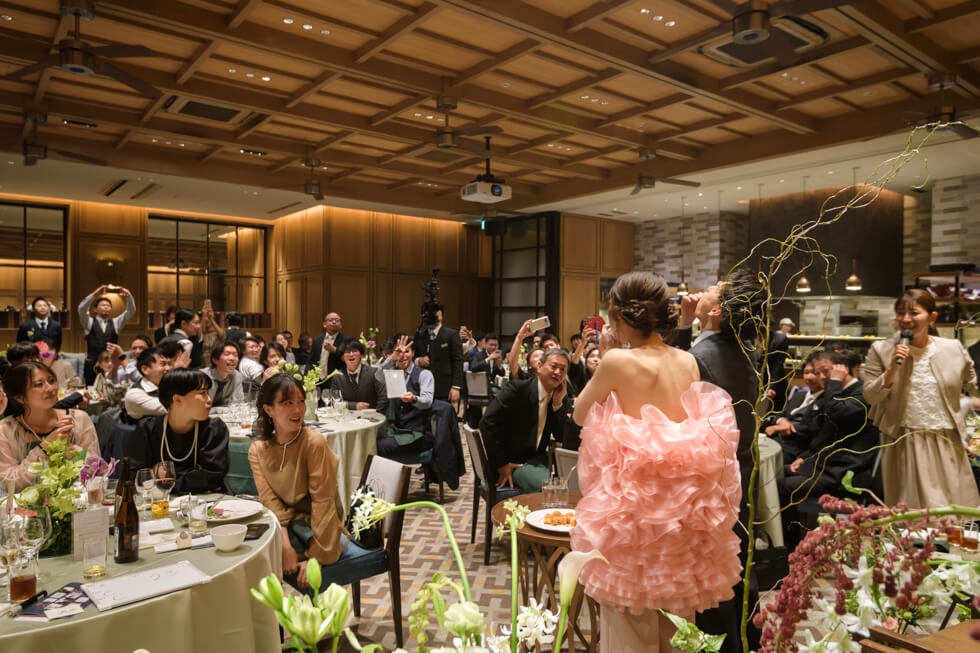 ゲストとの写真撮影でも、周りをパッと明るくする華やかなピンクのフリルが存在感を出します。