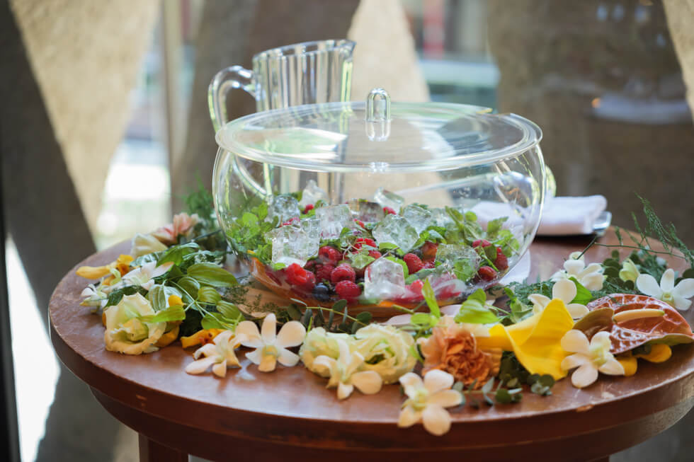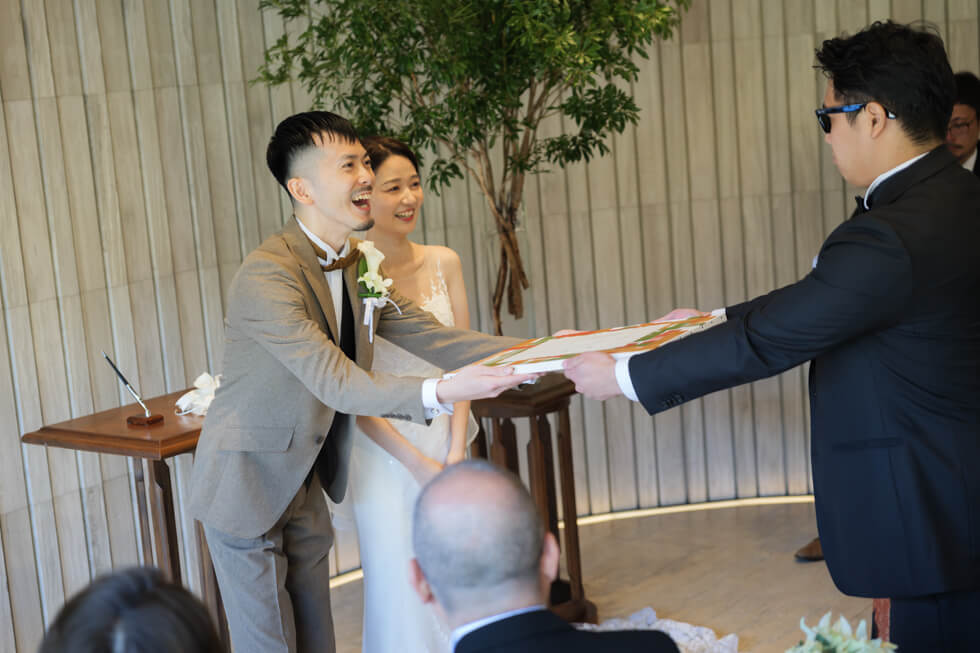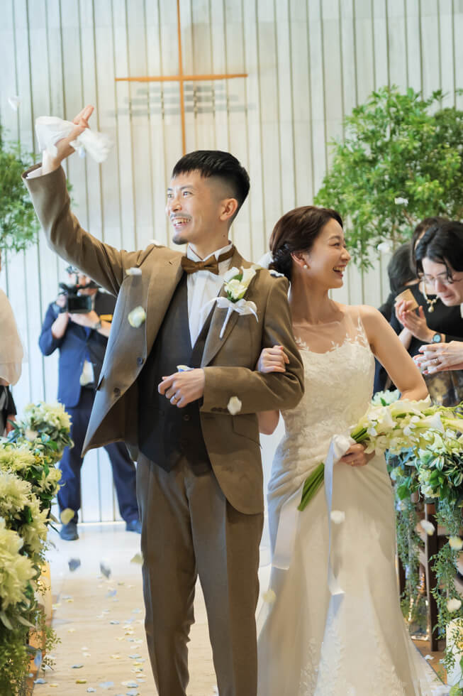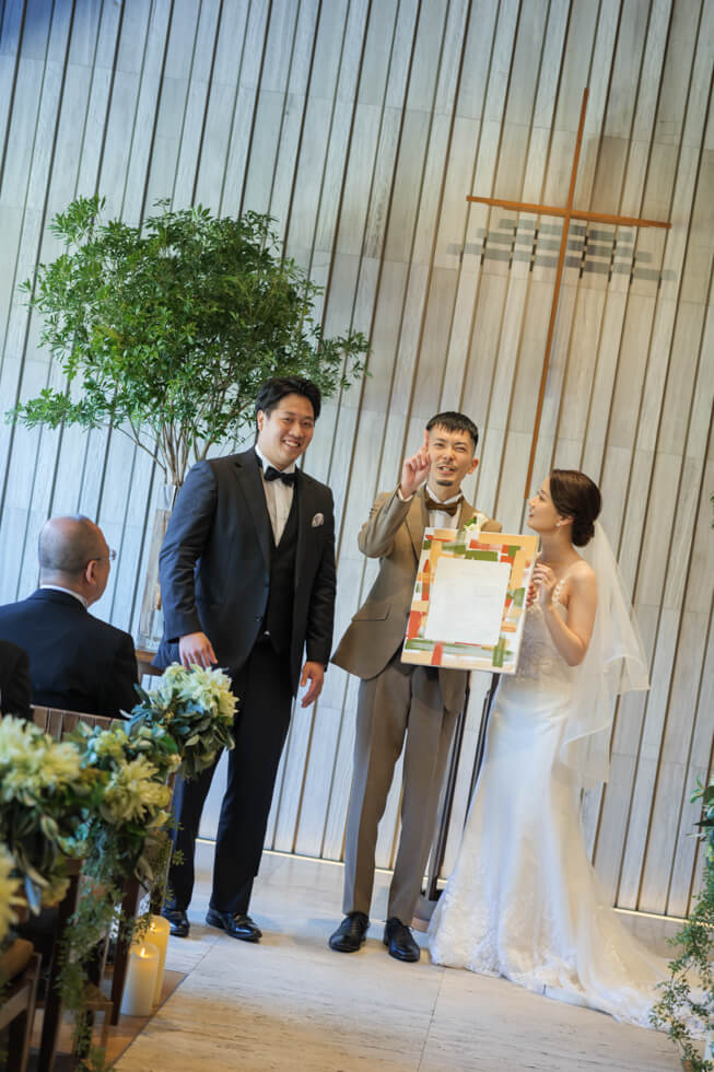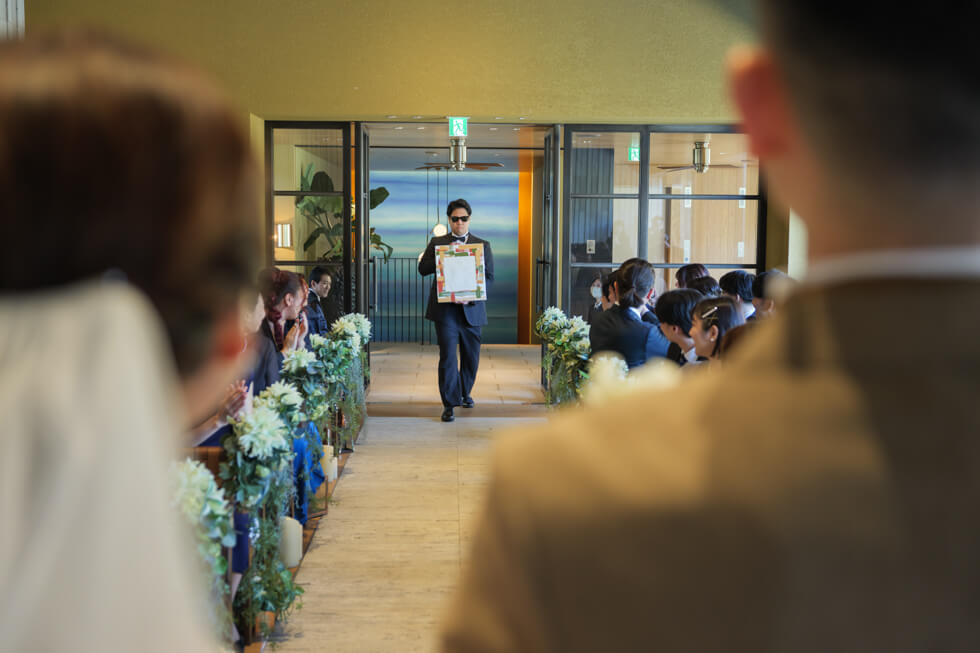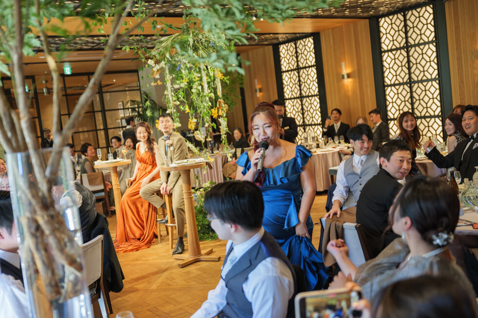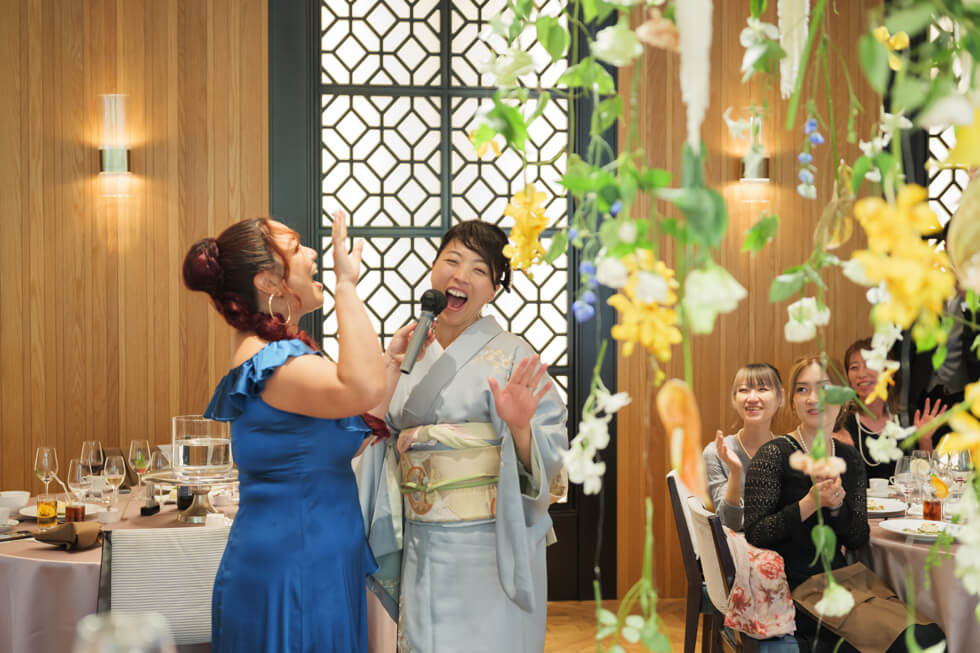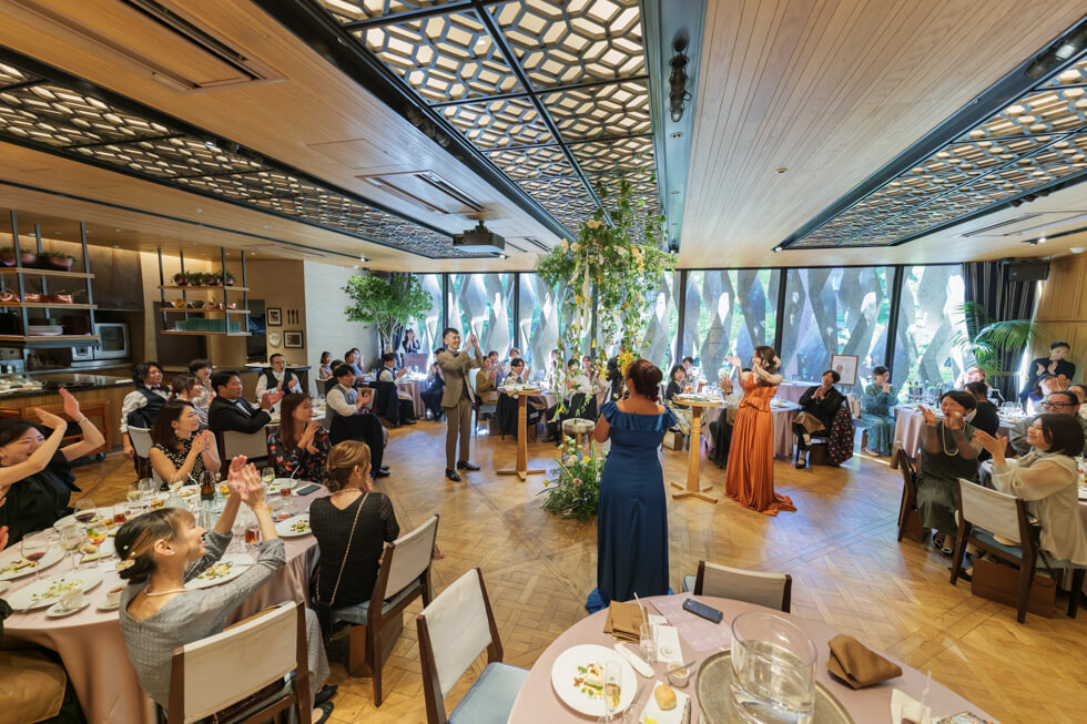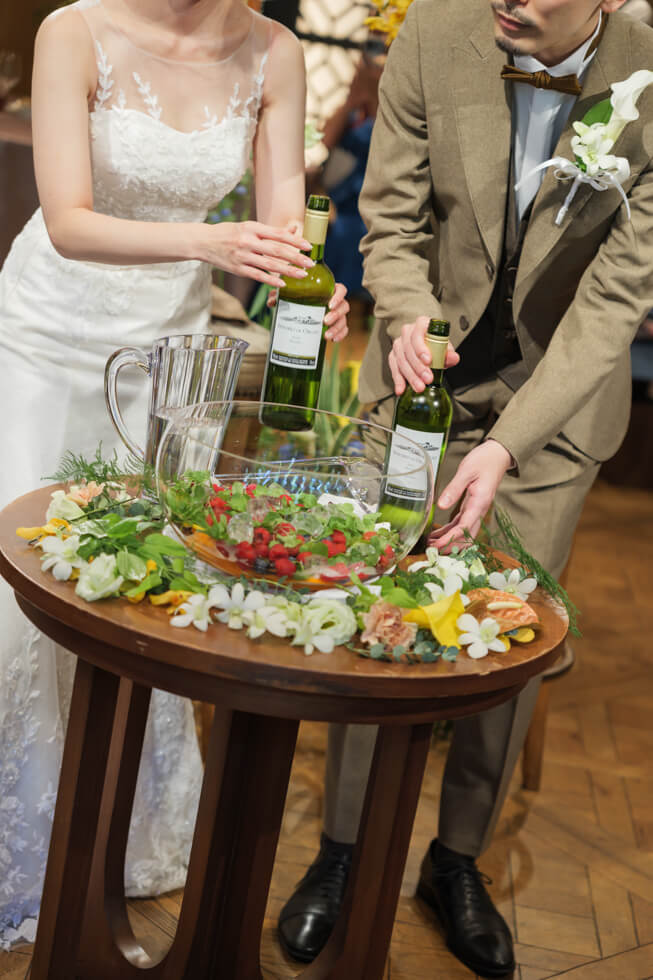 パーティではおふたりが果実酒を仕上げる演出をお披露目後に皆様にお酒を振る舞ったり、余興でゲストの方より歌のプレゼントが始まるなど大盛り上がり。歌の最後には式当日お誕生日を迎えたご新郎様へサプライズケーキが登場するなど、最後まで賑わいが絶えないお時間となりました。