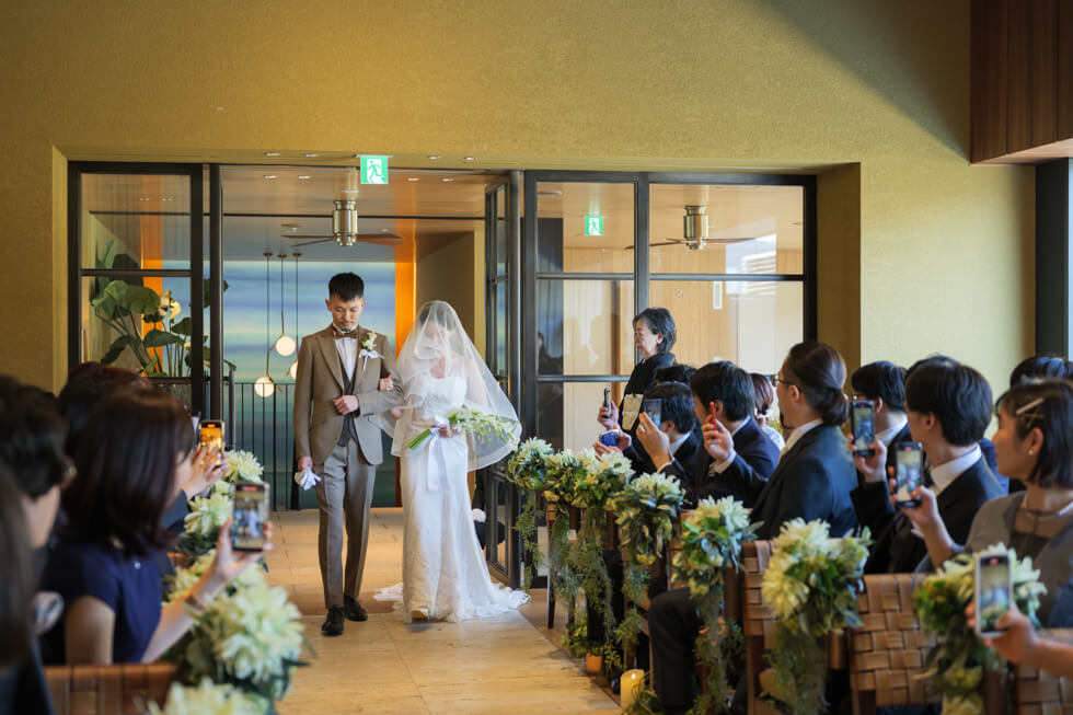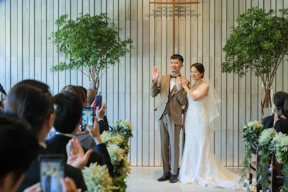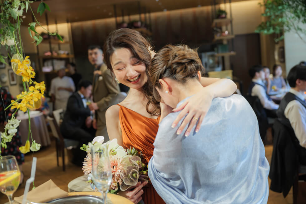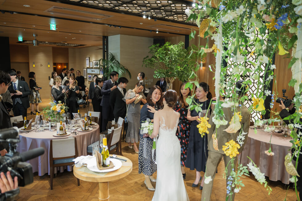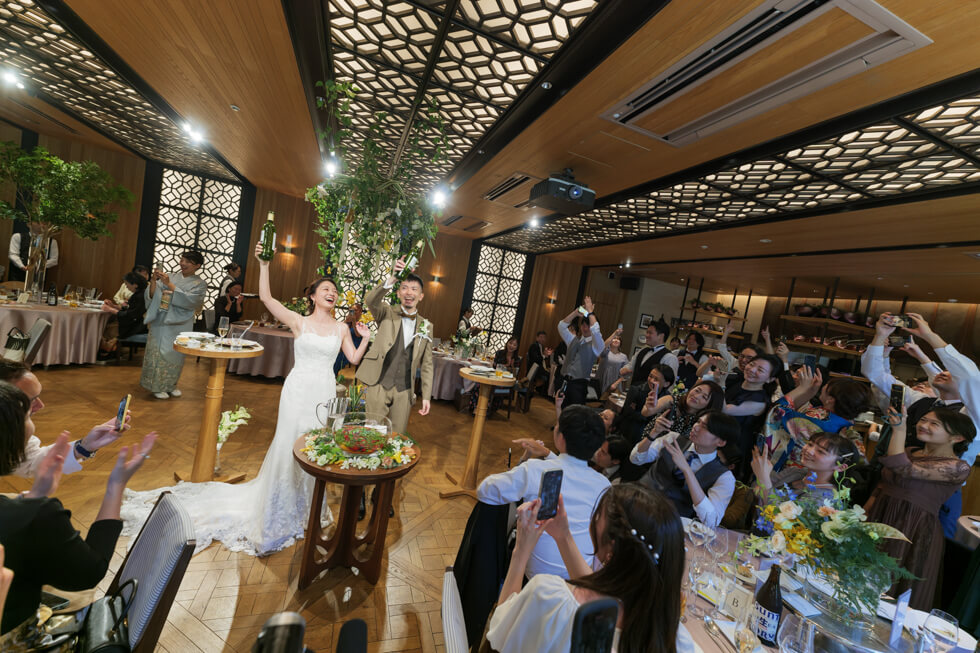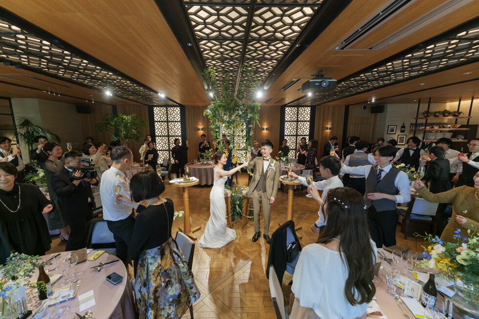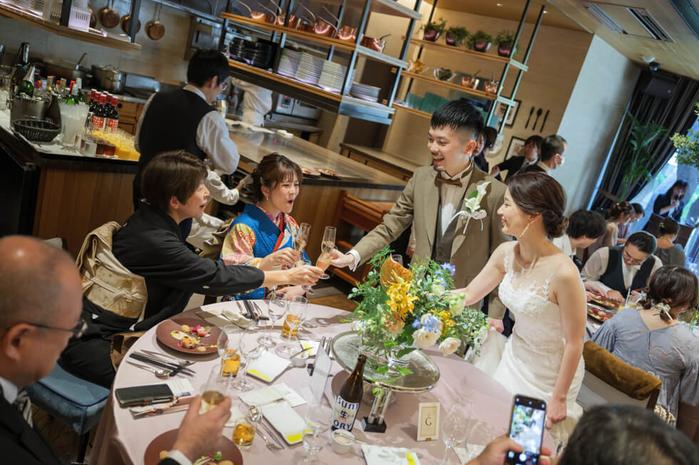ゲストの皆様にも飲み会に来ているような気持で気軽に楽しんで欲しいという想いをこめて、乾杯では新郎新婦が会場を一周。お一人おひとりに「おめでとう」「ありがとう」が伝わる乾杯で開宴となりました。