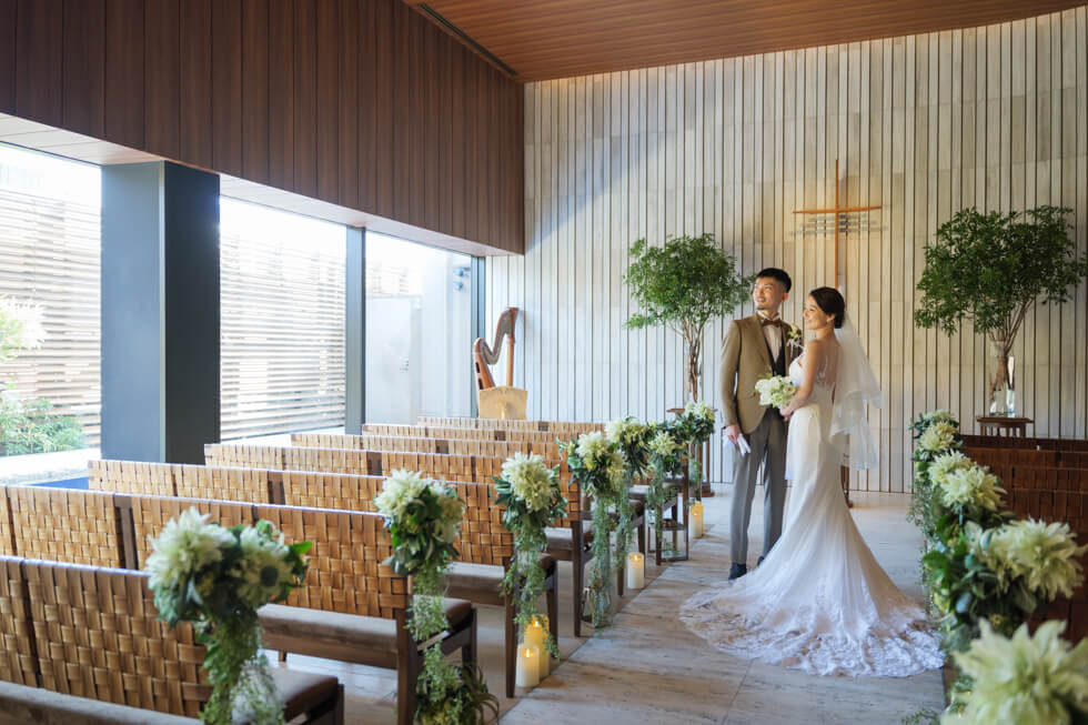 「中立~フェア~」を大切にされているおふたり。そんなおふたりのお席は会場の中央にセッティングし、ゲストのどのお席から見てもおふたりが同じように見えるおふたりらしいコーディネートでご用意しました。