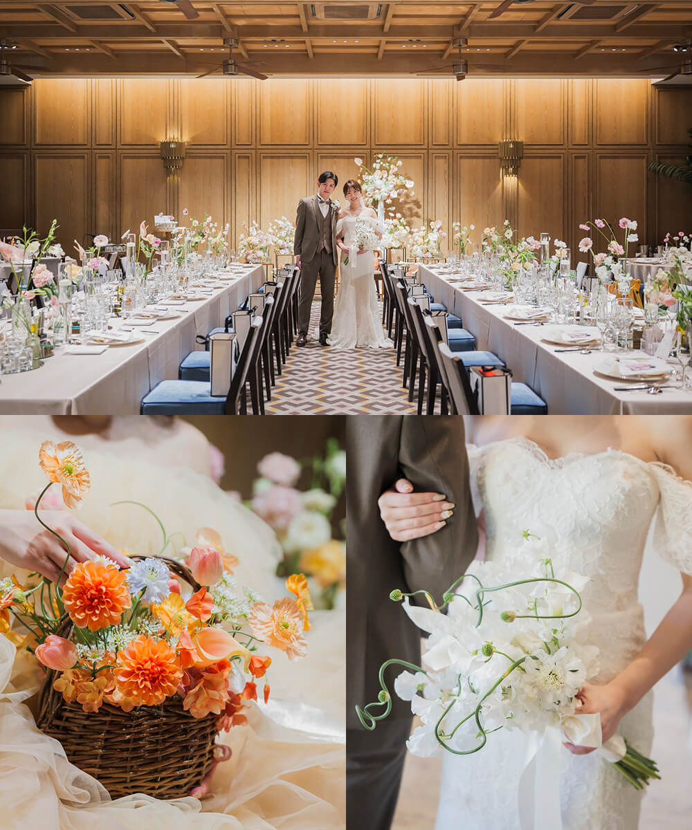 テーマをもとに、全体の世界観を考えました。目指したのは、韓国ウェディングのようなナチュラルで上品な雰囲気。春のお花をふんだんに取り入れて、季節感あふれる明るい会場やブーケに仕上げていただきました。
