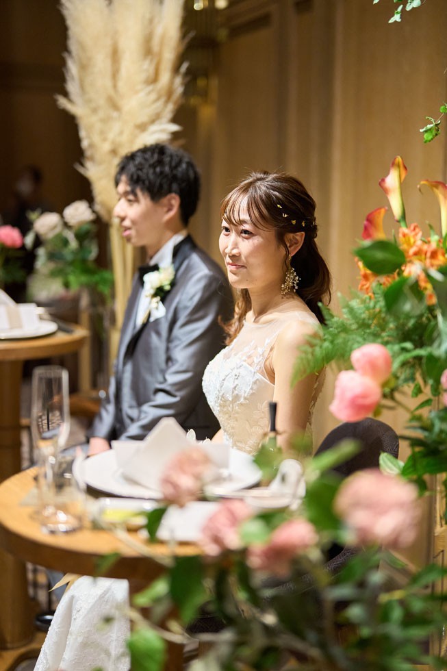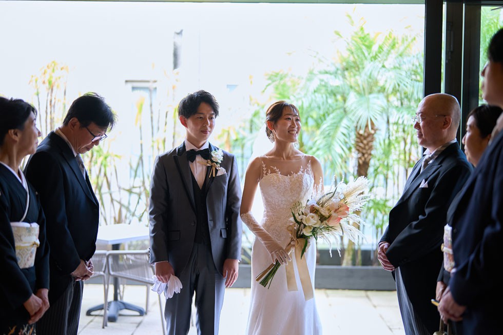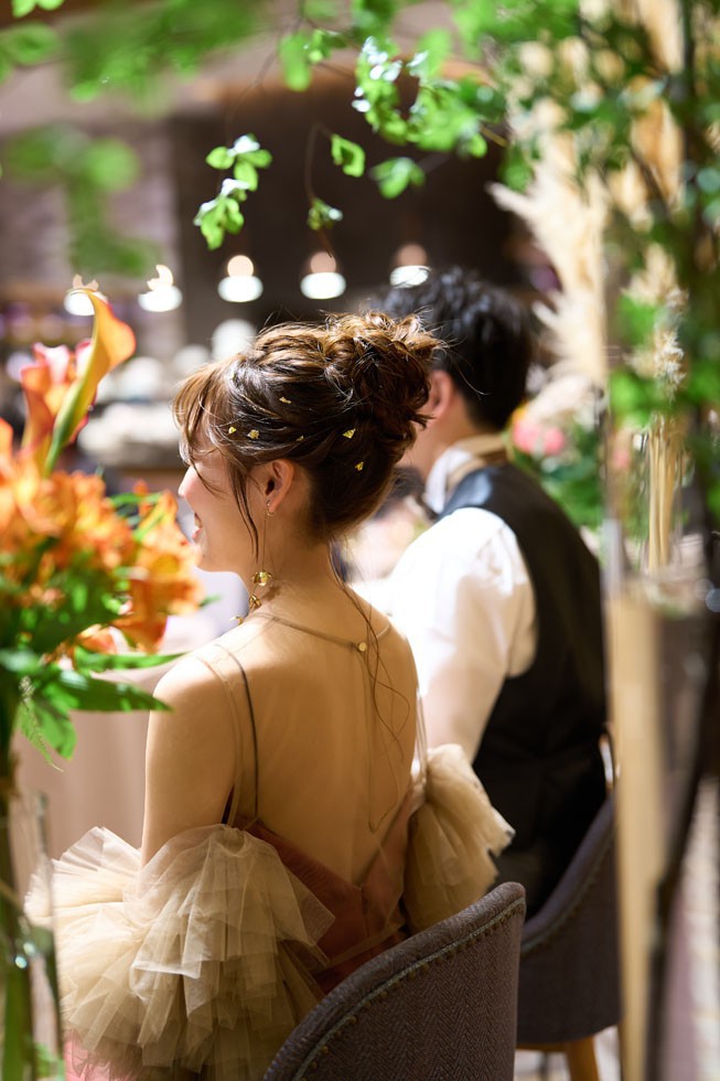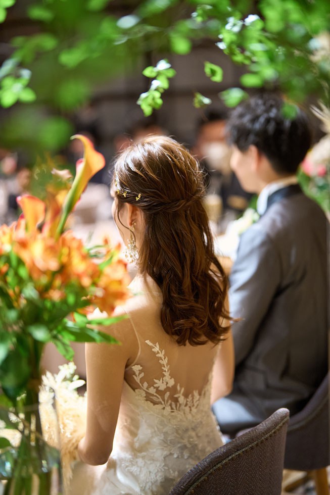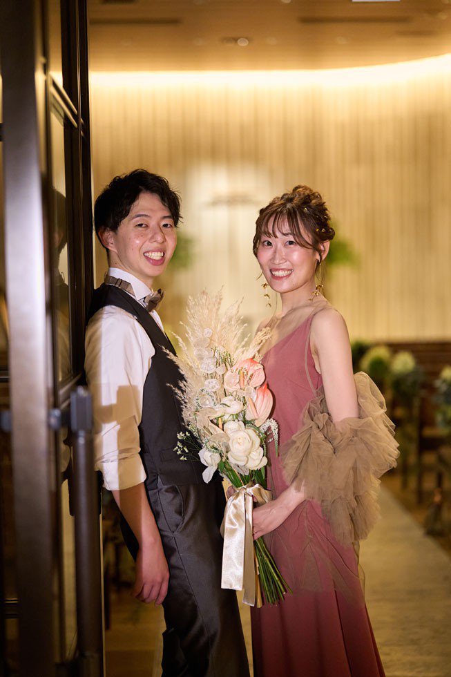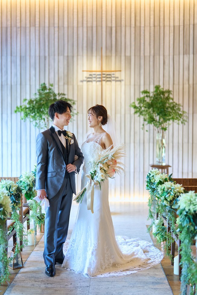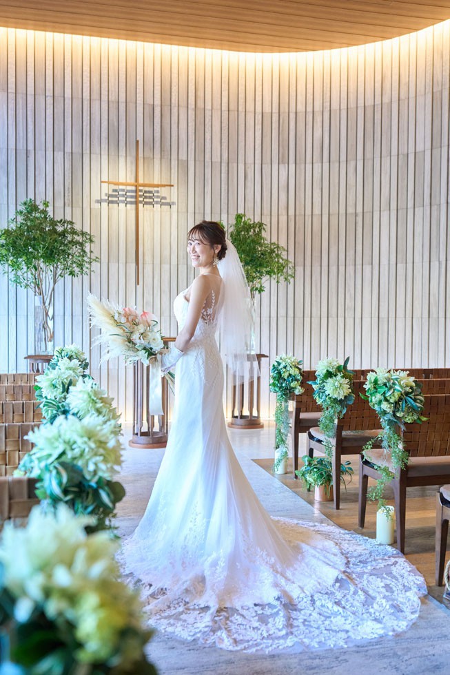 ご新婦様の上品な雰囲気にとても似合うドレスはソフトマーメイド、バックトレーンの刺繍がとても印象的なウェディングドレス。合わせるのは柔らかいカラーのパンパスグラスやアンスリウムのクラッチブーケ。会場装花は緑を沢山取り入れ、高低差をつけた花器、メインはハイチェアタイプでより一層おしゃれに。お色直しはブラウンテラコッタのカラードレス。ご披露宴中はたくさんのゲストに囲まれ、お写真撮影をしたり、沢山の会話を楽しんだり、笑顔の絶えない温かいお時間となりました。お開き後は、おふたりで再度写真撮影に。明るい時間帯のチャペルやウォーターテラスとお開き後のナイトチャペル、ライトアップされたテラスでの撮影は午後のパーティーならではです。