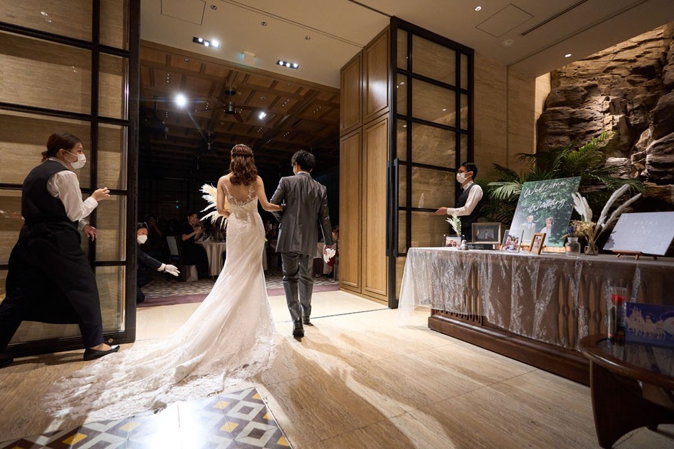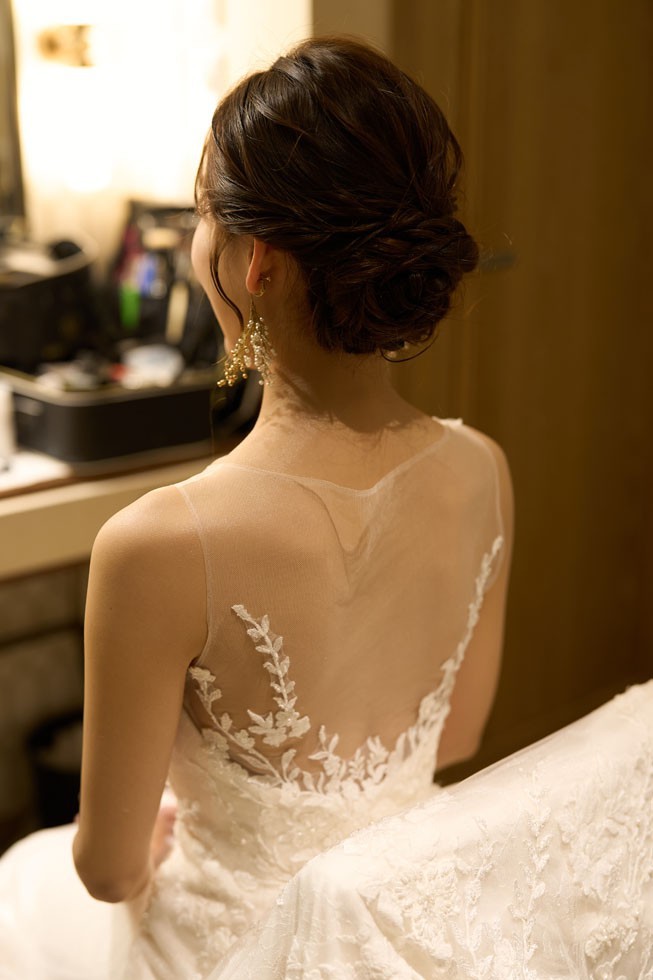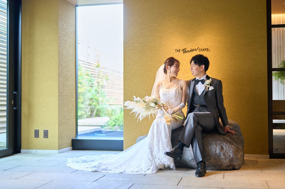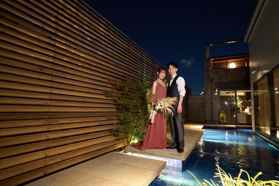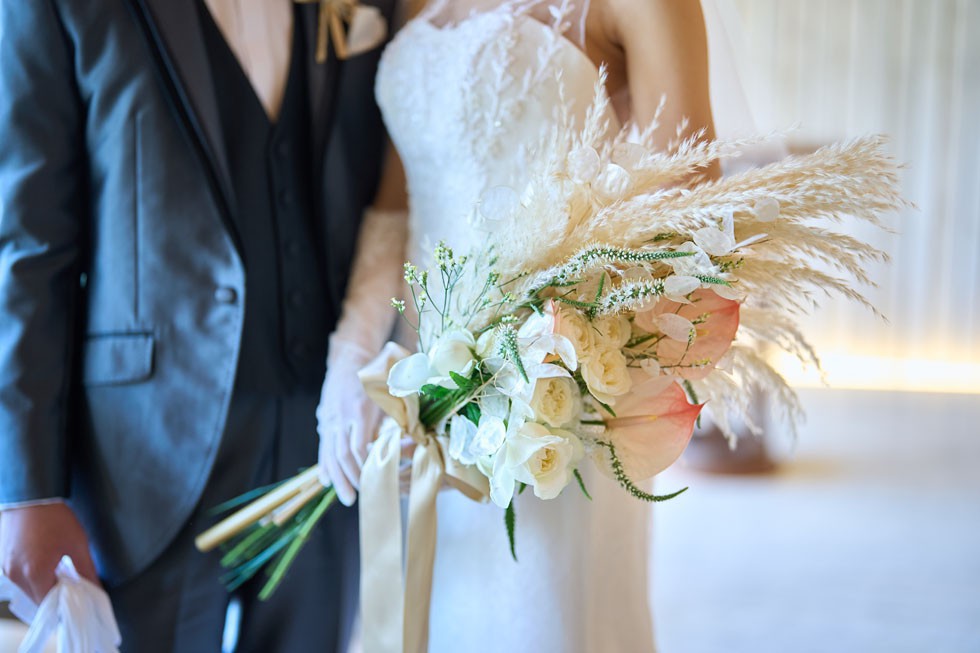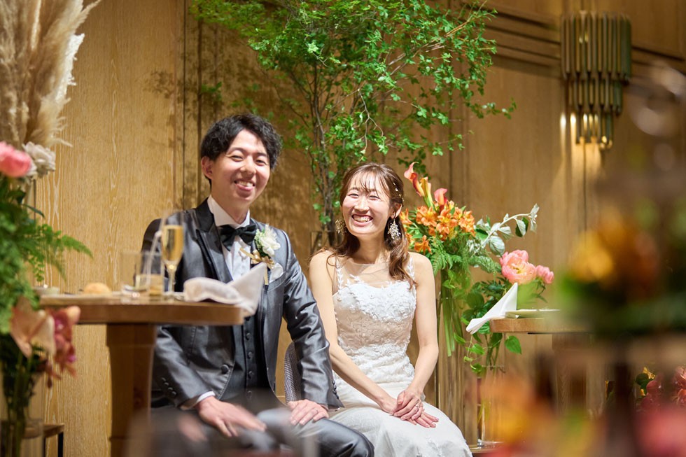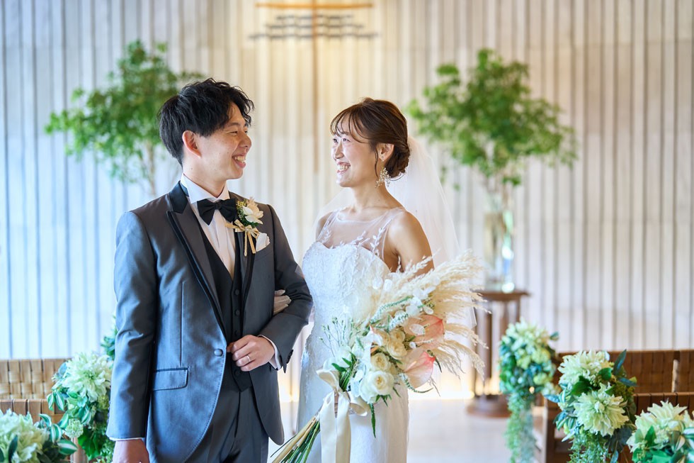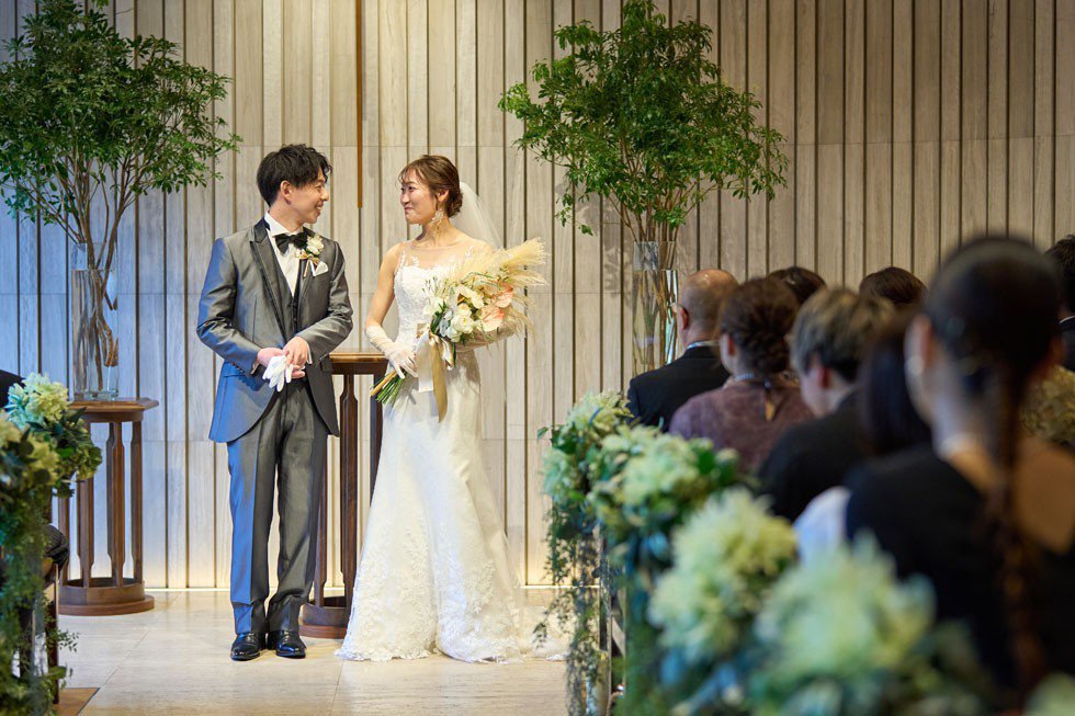 ご新婦様の上品な雰囲気にとても似合うドレスはソフトマーメイド、バックトレーンの刺繍がとても印象的なウェディングドレス。合わせるのは柔らかいカラーのパンパスグラスやアンスリウムのクラッチブーケ。会場装花は緑を沢山取り入れ、高低差をつけた花器、メインはハイチェアタイプでより一層おしゃれに。お色直しはブラウンテラコッタのカラードレス。ご披露宴中はたくさんのゲストに囲まれ、お写真撮影をしたり、沢山の会話を楽しんだり、笑顔の絶えない温かいお時間となりました。お開き後は、おふたりで再度写真撮影に。明るい時間帯のチャペルやウォーターテラスとお開き後のナイトチャペル、ライトアップされたテラスでの撮影は午後のパーティーならではです。