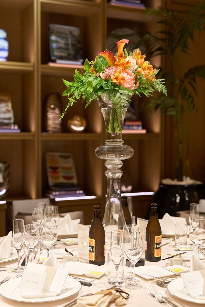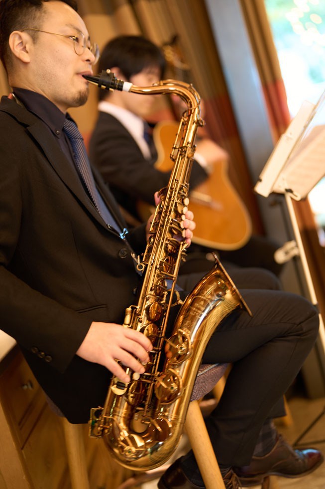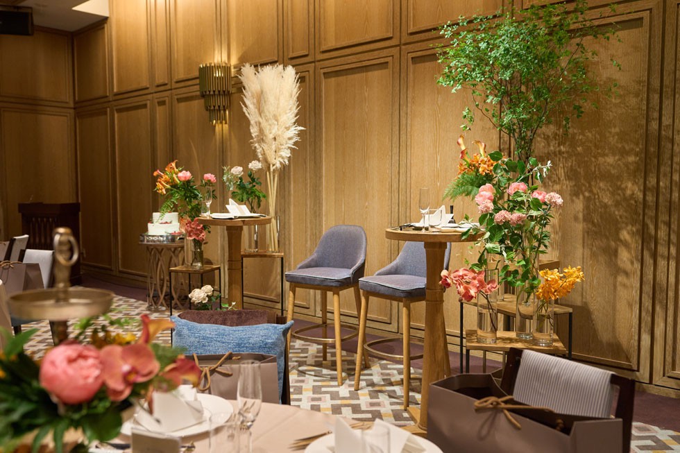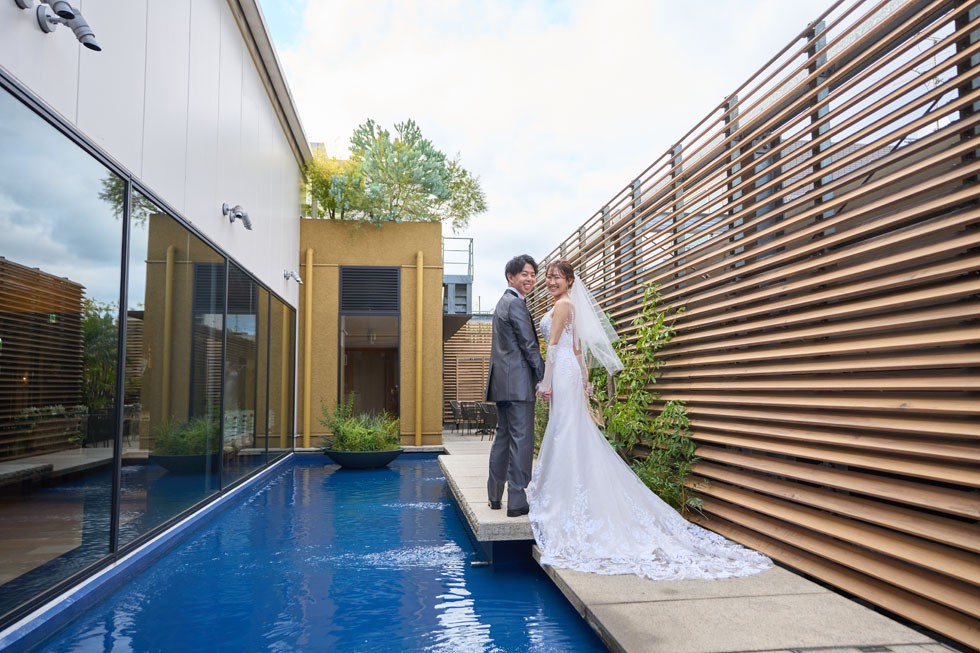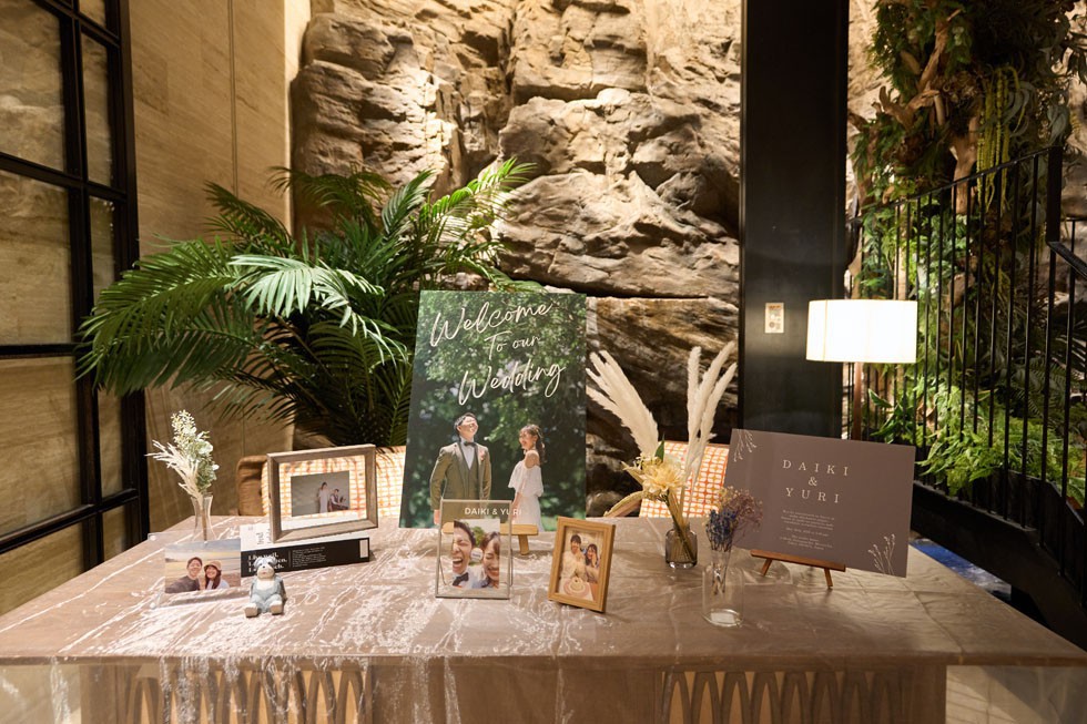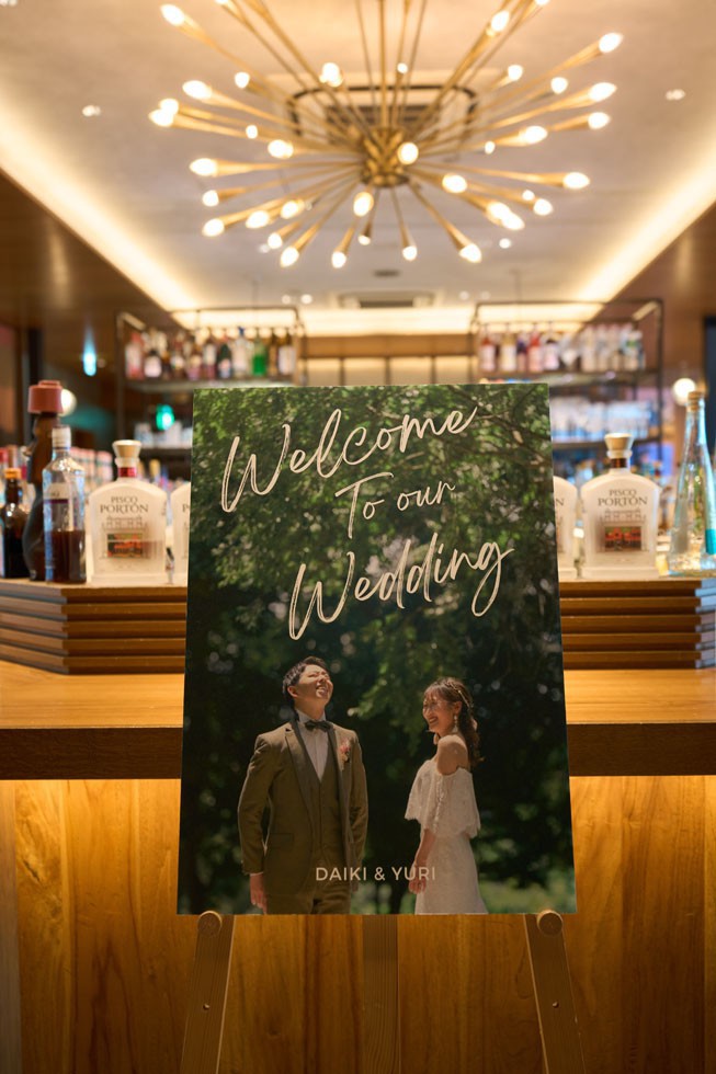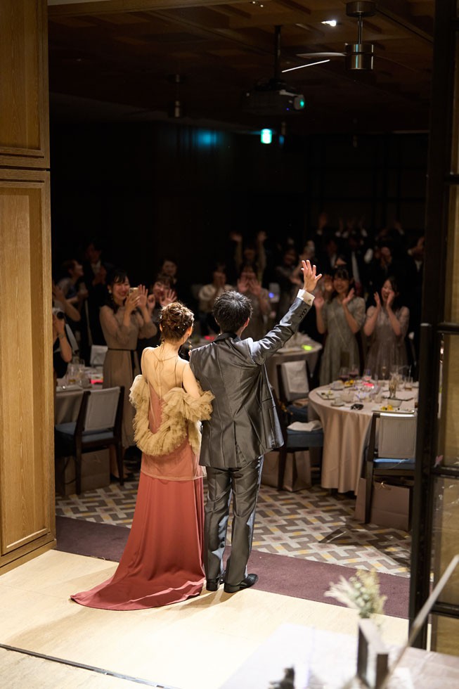 ご新婦様の上品な雰囲気にとても似合うドレスはソフトマーメイド、バックトレーンの刺繍がとても印象的なウェディングドレス。合わせるのは柔らかいカラーのパンパスグラスやアンスリウムのクラッチブーケ。会場装花は緑を沢山取り入れ、高低差をつけた花器、メインはハイチェアタイプでより一層おしゃれに。お色直しはブラウンテラコッタのカラードレス。ご披露宴中はたくさんのゲストに囲まれ、お写真撮影をしたり、沢山の会話を楽しんだり、笑顔の絶えない温かいお時間となりました。お開き後は、おふたりで再度写真撮影に。明るい時間帯のチャペルやウォーターテラスとお開き後のナイトチャペル、ライトアップされたテラスでの撮影は午後のパーティーならではです。
