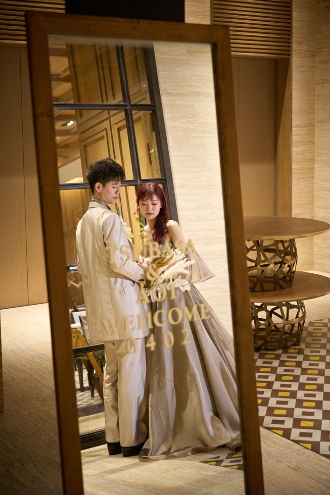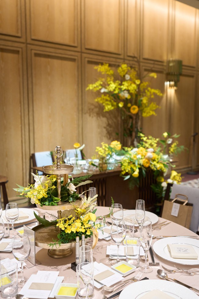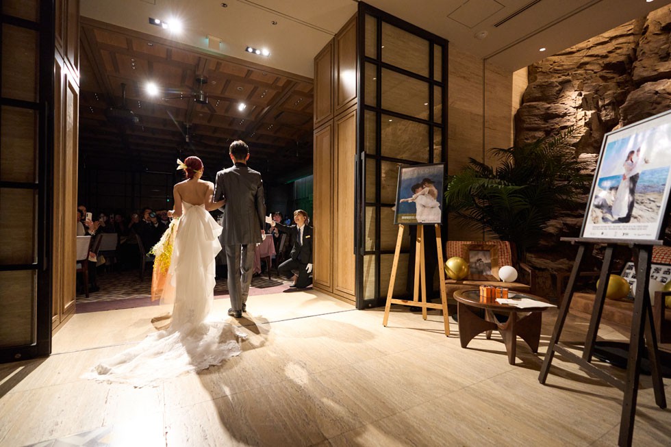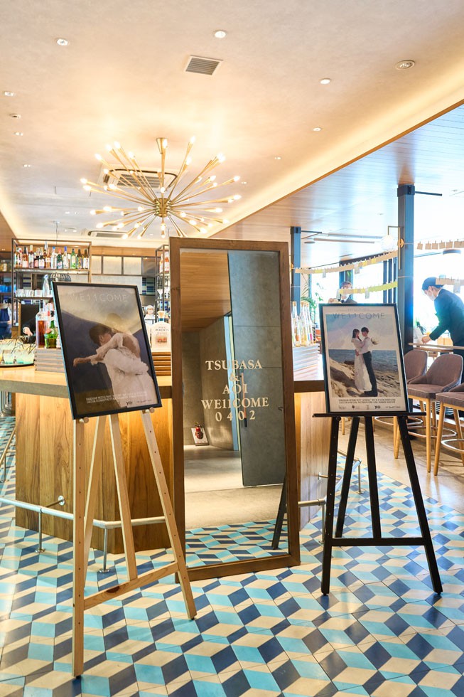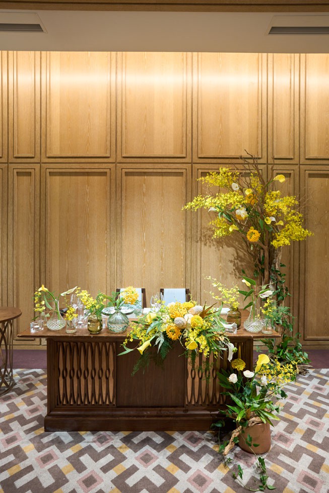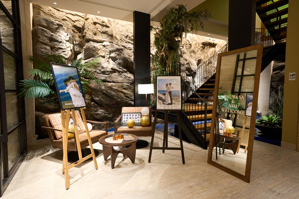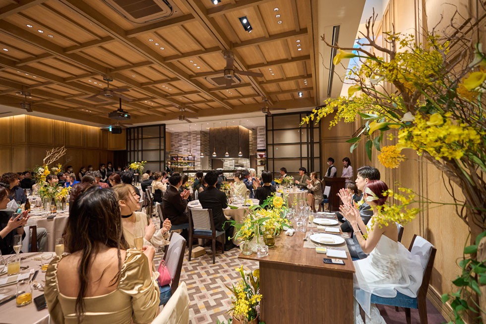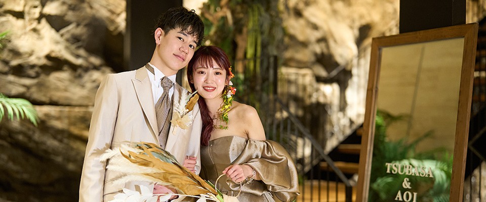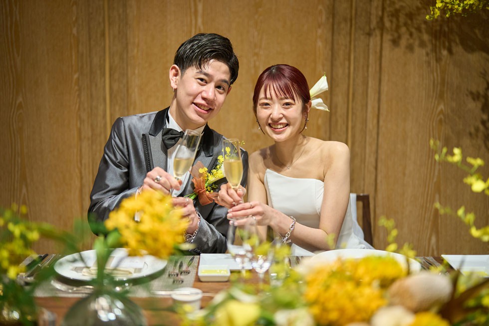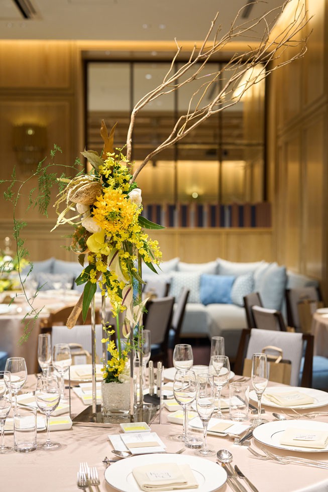 120名を超えるたくさんのゲストと過ごした二人らしさがつまったご結婚式をご紹介。ウェルカムラウンジにはゲストも写真で全身を収められるように大きな縦長のウェルカムミラーをご用意。写真スポットとなっていました。会場装花は鮮やかなイエローが特徴的な花言葉は”一緒に踊って”のオンシジウムが彩ります。