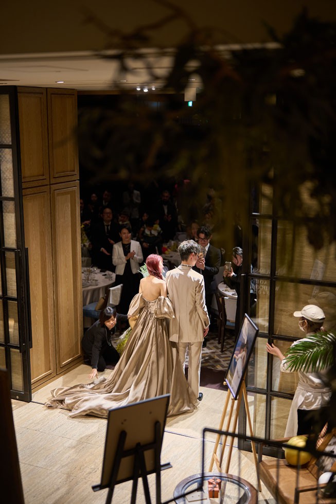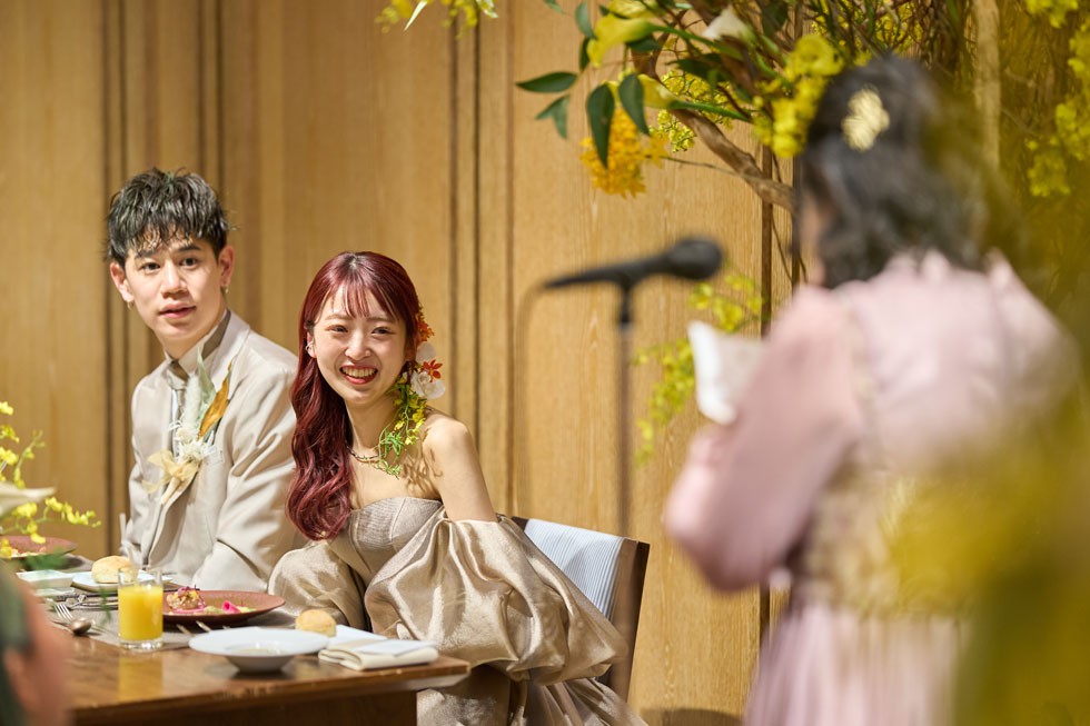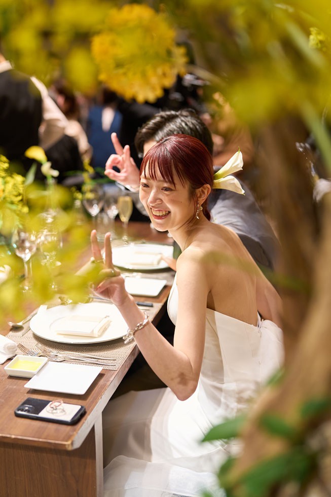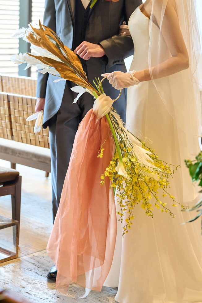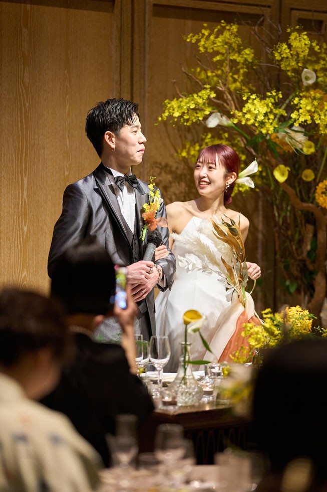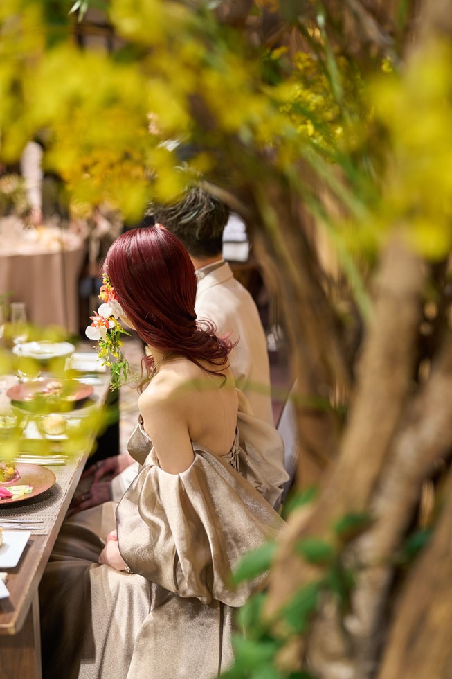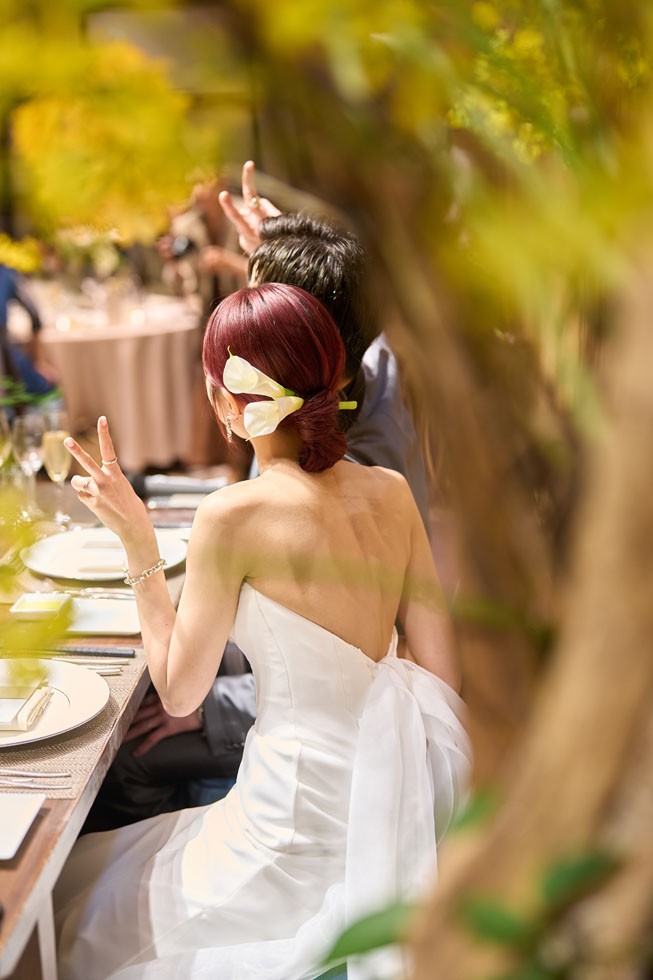ウェディングドレスはスレンダーなシンプルなフロントにバックコンシャスな1着。シンプルながらもデザイン性が高い人気のドレスです。赤いヘアカラーに白のカラーを挿したスタイルがとてもお似合いです。お色直しはパフスリーブのベージュゴールドの華やかなデザインのカラードレス。会場装花のオンシジウムのイエローと相まってアットホームな雰囲気も創り出します。たくさんのゲストにもご登場いただき、笑いの絶えない最幸なお時間となりました。