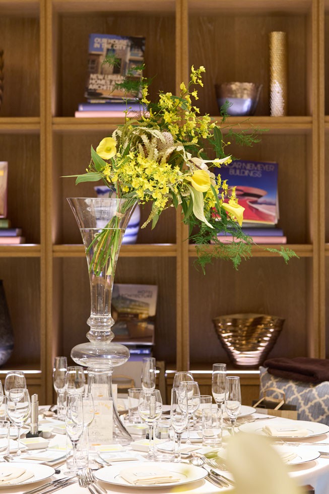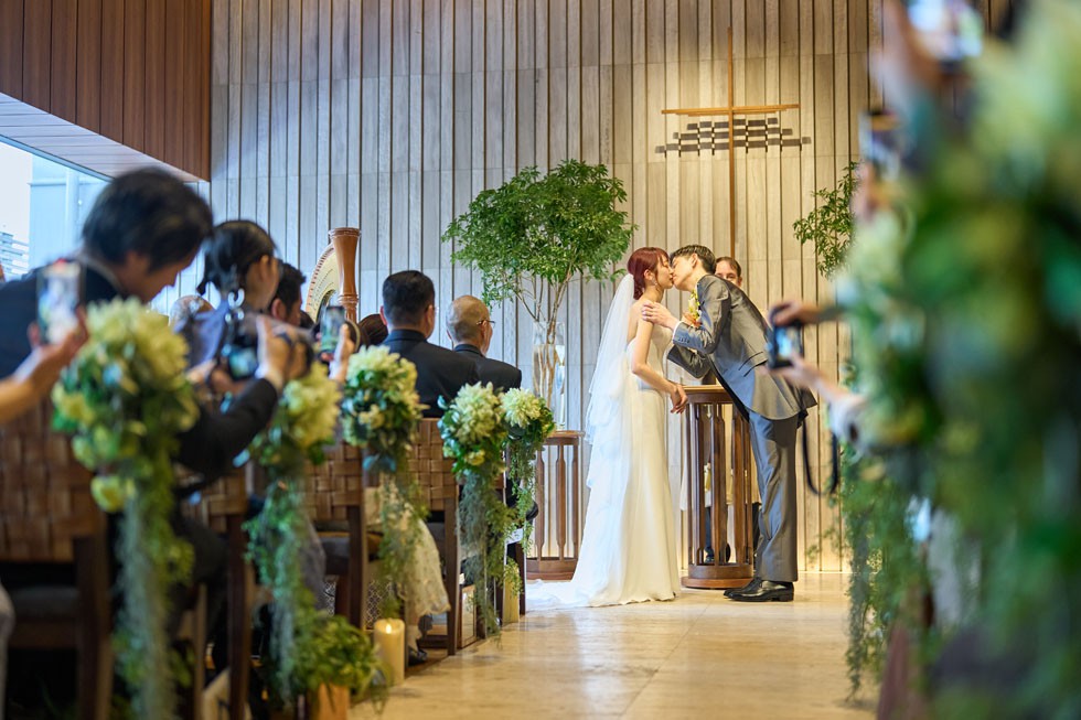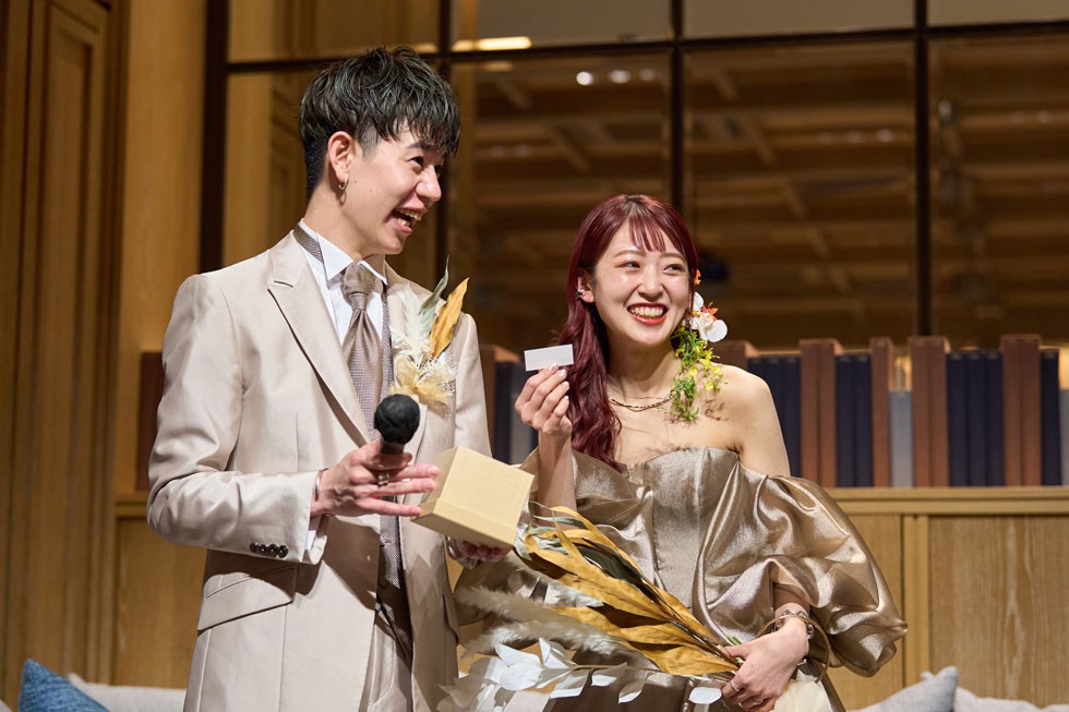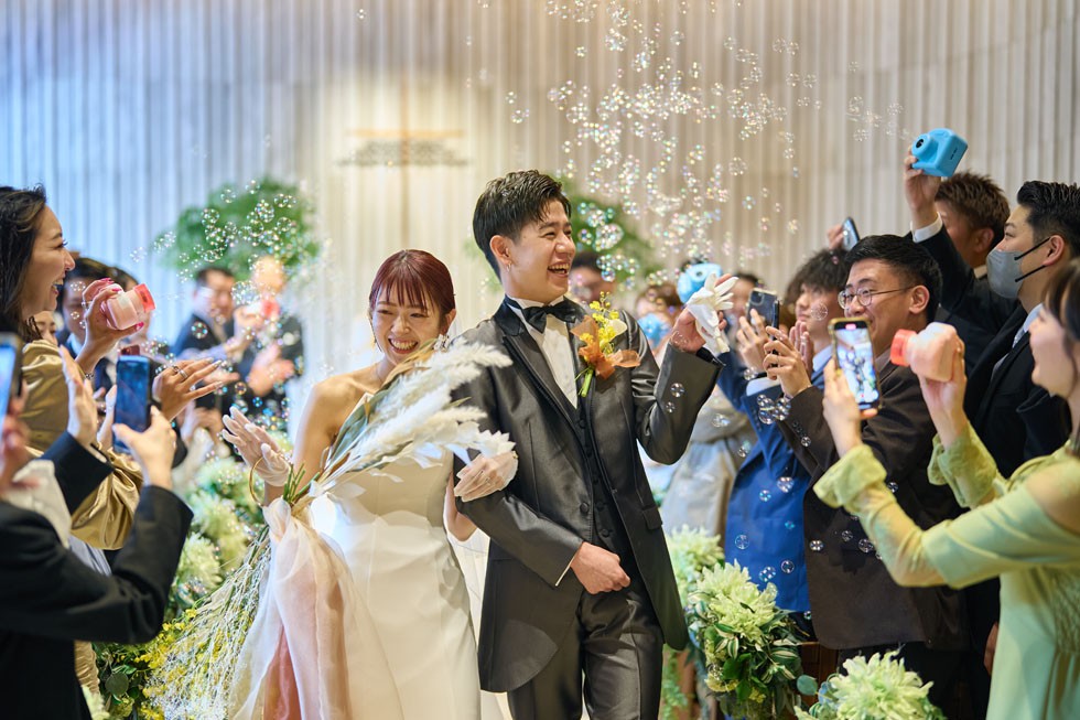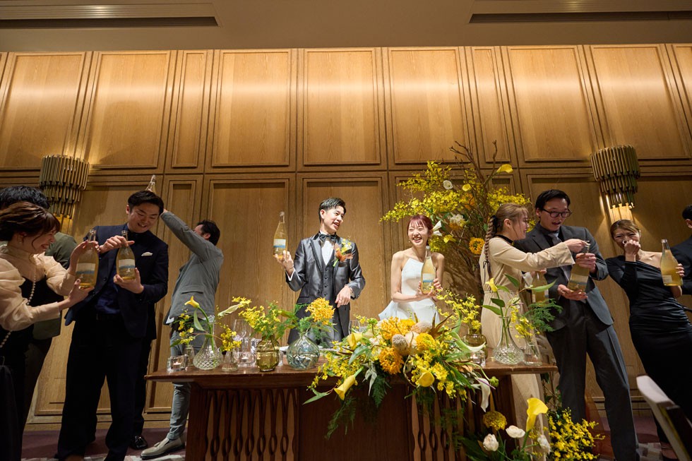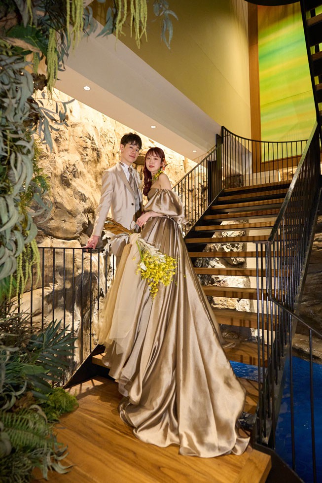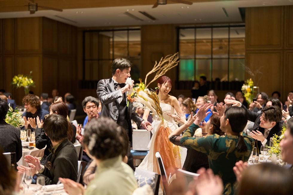 ウェディングドレスはスレンダーなシンプルなフロントにバックコンシャスな1着。シンプルながらもデザイン性が高い人気のドレスです。赤いヘアカラーに白のカラーを挿したスタイルがとてもお似合いです。お色直しはパフスリーブのベージュゴールドの華やかなデザインのカラードレス。会場装花のオンシジウムのイエローと相まってアットホームな雰囲気も創り出します。たくさんのゲストにもご登場いただき、笑いの絶えない最幸なお時間となりました。