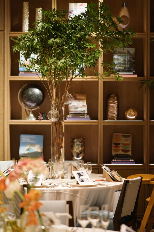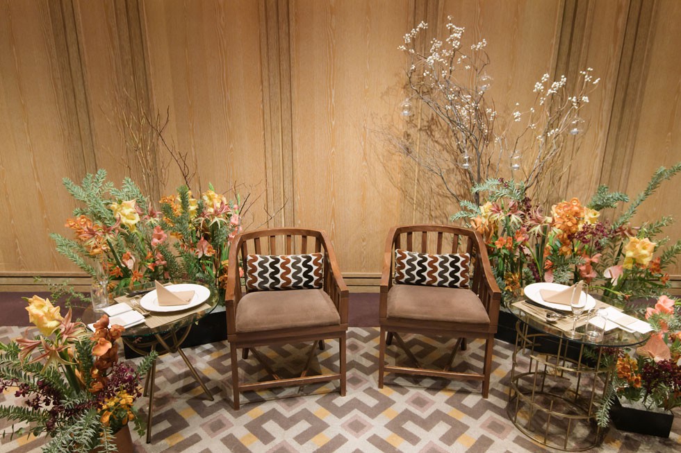 ご新婦様が特にこだわったメインチェア装花は、秋らしいオータムカラーをベースにアシンメトリーなデザインと地面から立ち上がるように装飾された枝アレンジメント。キャンドルカップもついており、照明暗転時にはキャンドルの灯がゆらゆらと動く仕掛けに。