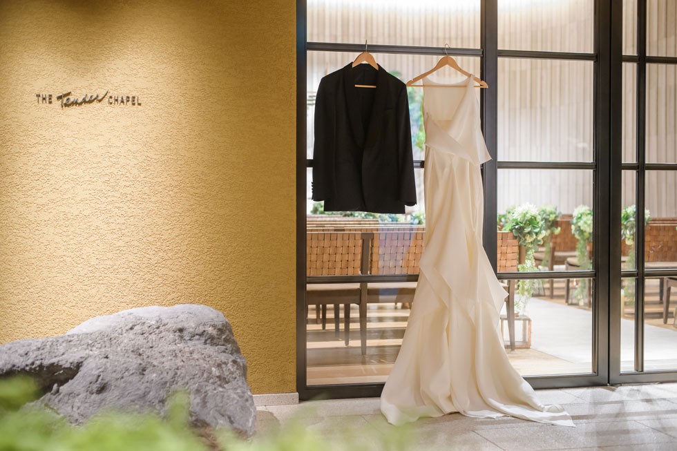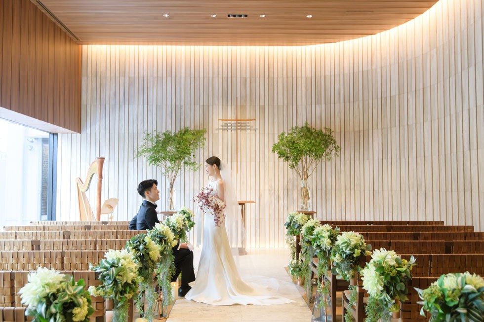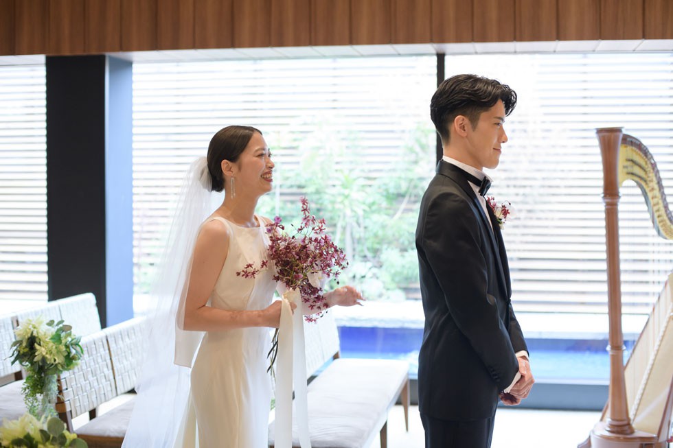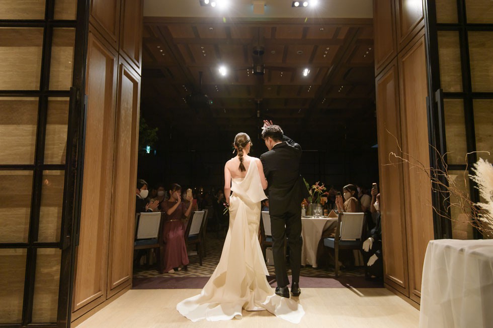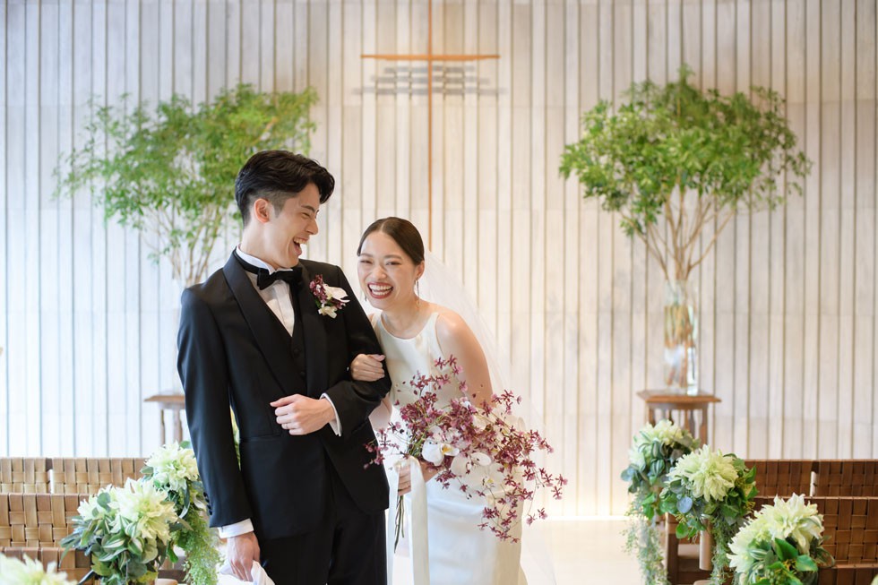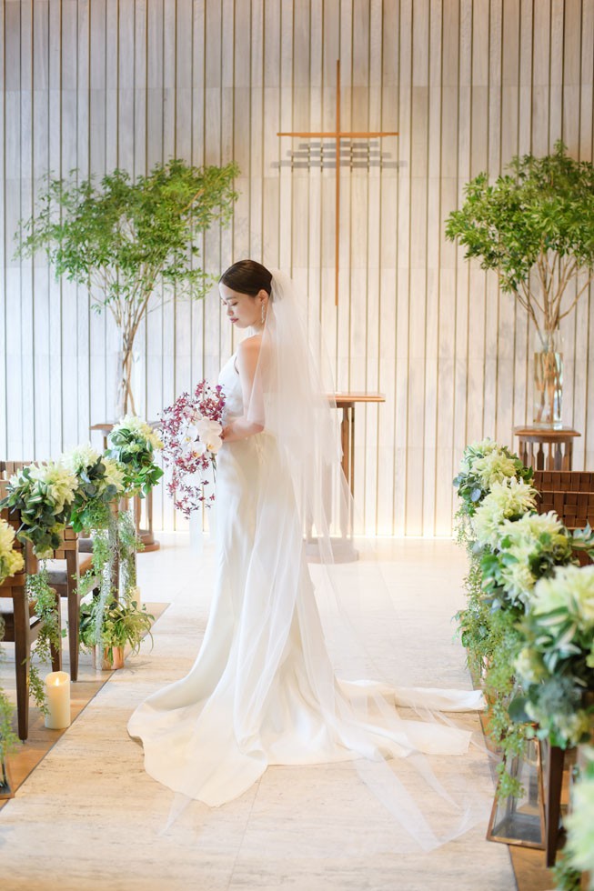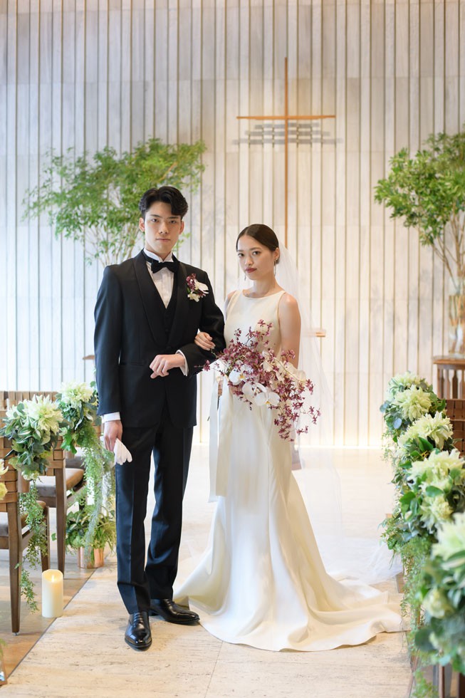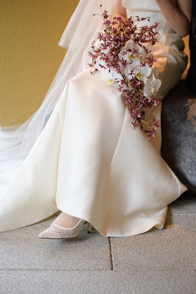 フロントはシンプルに、バックコンシャスなドレスは上質さと洗練さ、そして華やかさを兼ね備えた1着。合わせるブーケには、胡蝶蘭を使用して大人な雰囲気を演出。