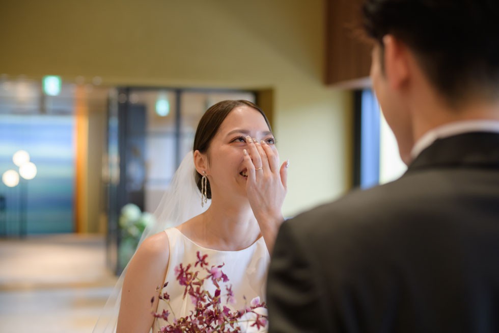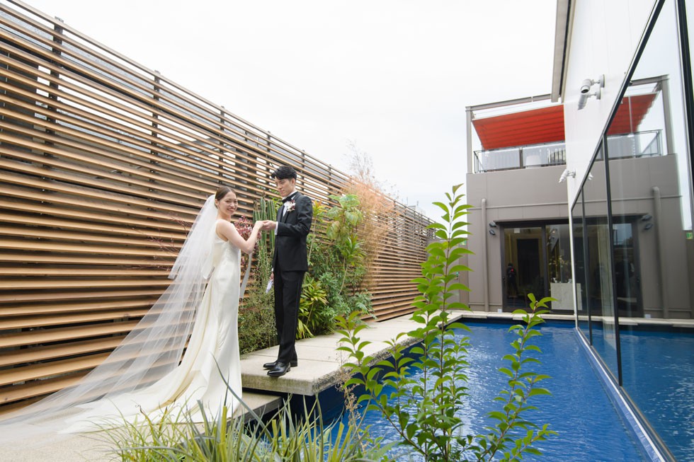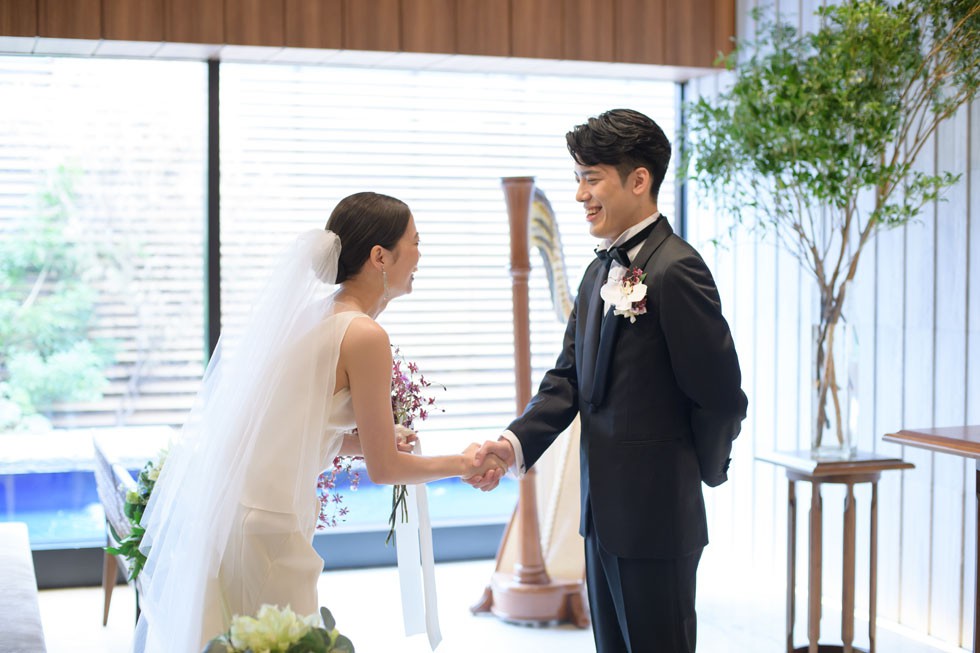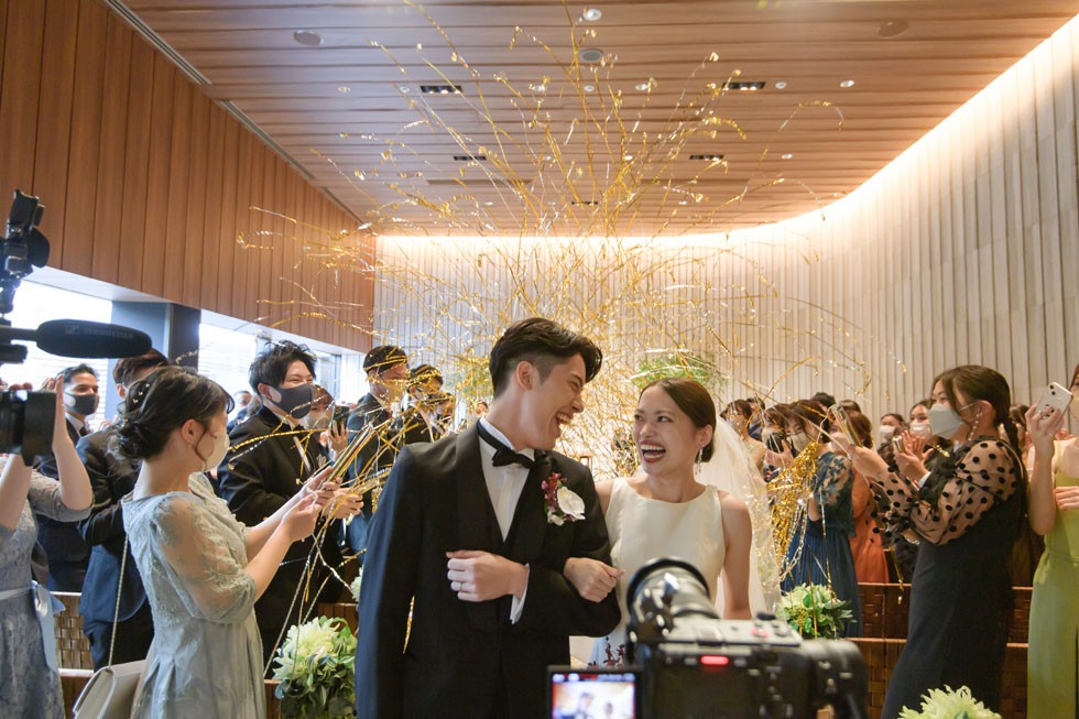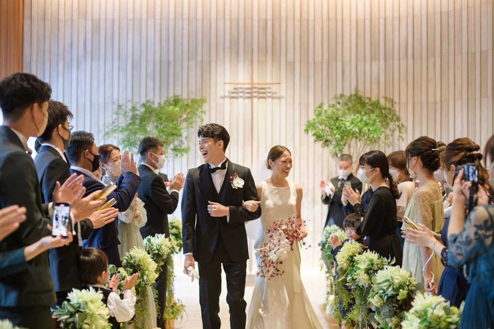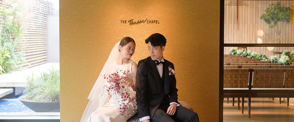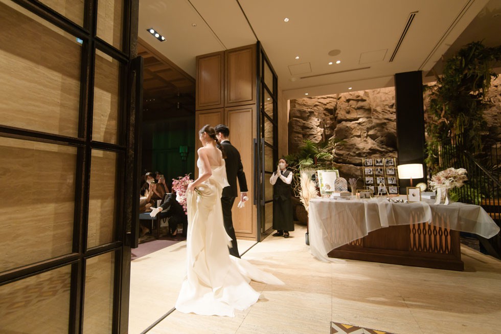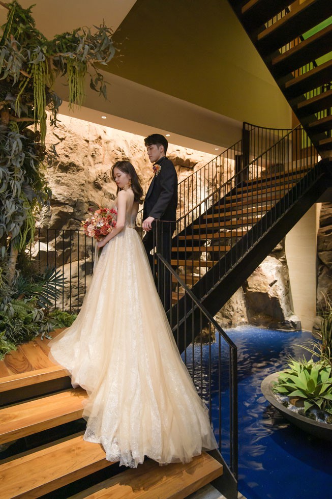 フロントはシンプルに、バックコンシャスなドレスは上質さと洗練さ、そして華やかさを兼ね備えた1着。合わせるブーケには、胡蝶蘭を使用して大人な雰囲気を演出。