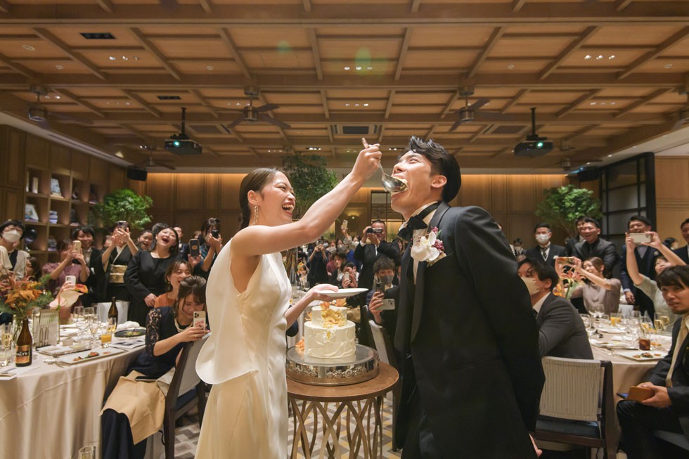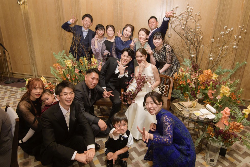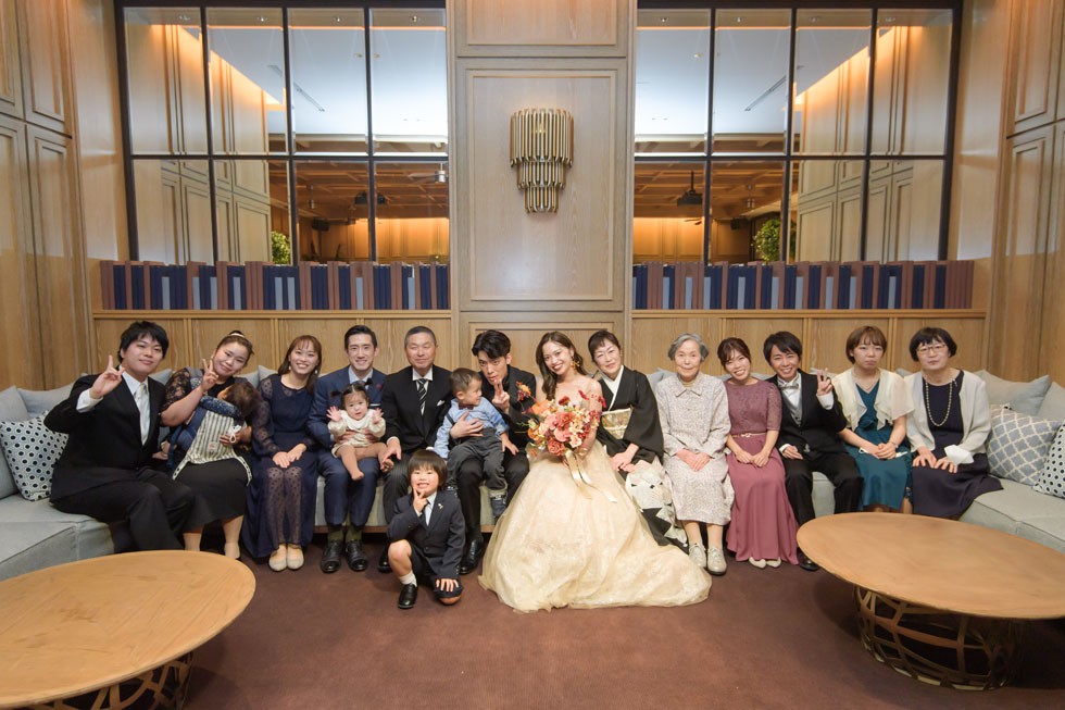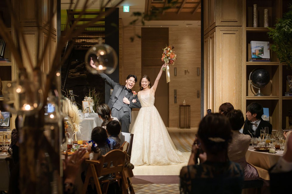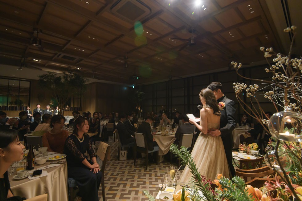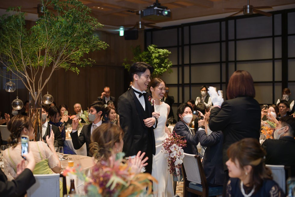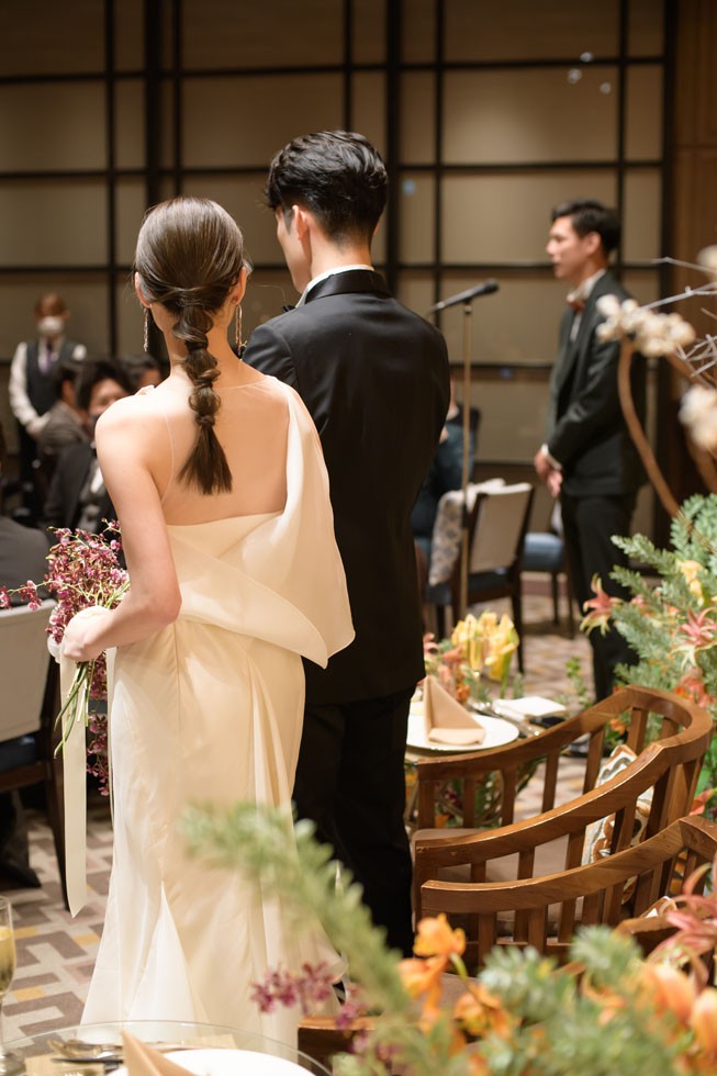 カラードレスはベージュカラー。ふんわりとしたヘアスタイルに会場装花と合わせたオータムカラーのブーケがとてもお似合いです。ゲストの皆様との距離の近さを大切にし、写真や歓談のお時間を多めにとりゲスト満足度も考えたご結婚式となりました。