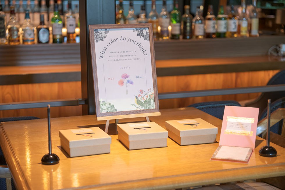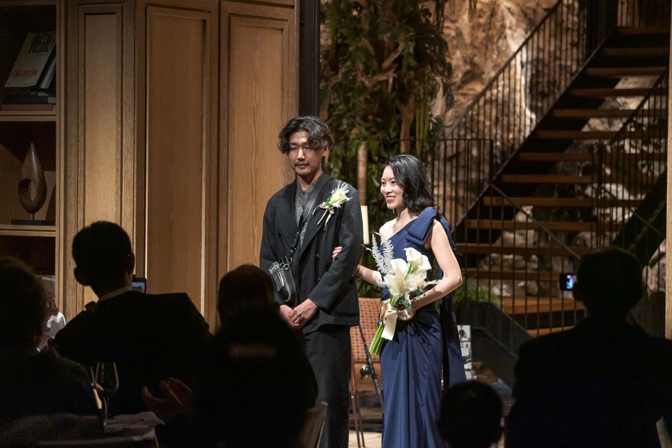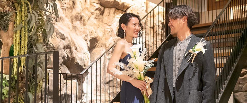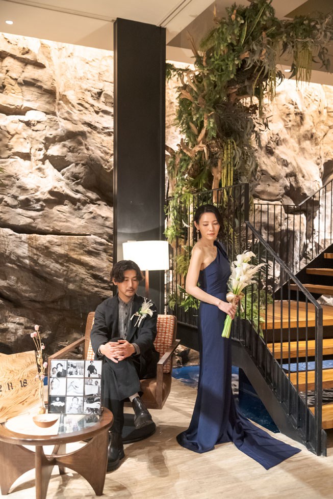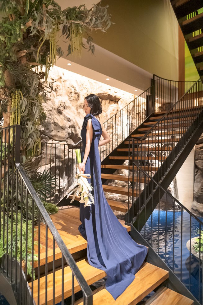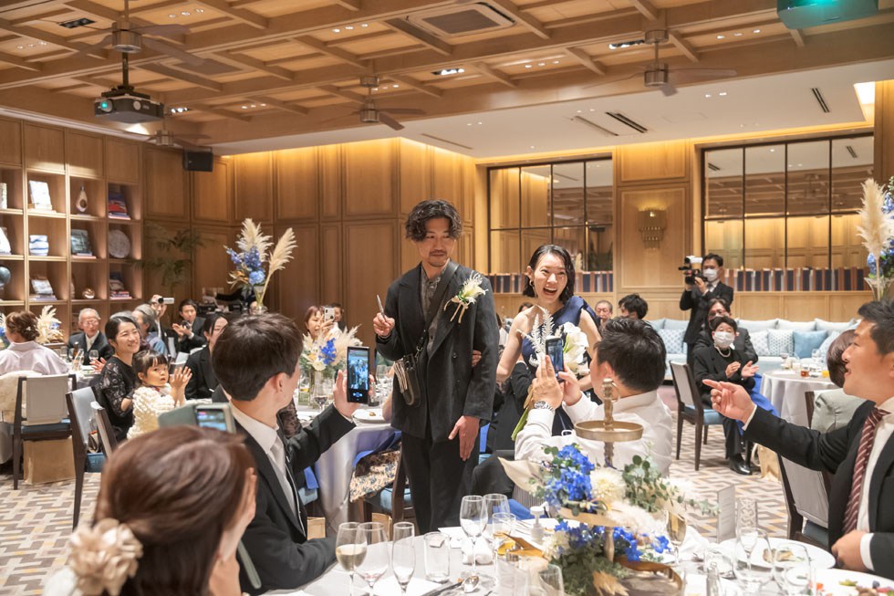 ご新郎様が美容師さんということで、お色直しにはなんとご新婦様のヘアカットを行い、ロングヘアからおしゃれなボブヘアへ。装花にも入っていたネイビーを合わせたワンショルダーのカラードレスがとてもお似合いです。演出を取り入れ過ぎず、美味しいお食事とゲストの皆様とのゆったりとしたお時間を過ごすアットホームなご結婚式となりました。