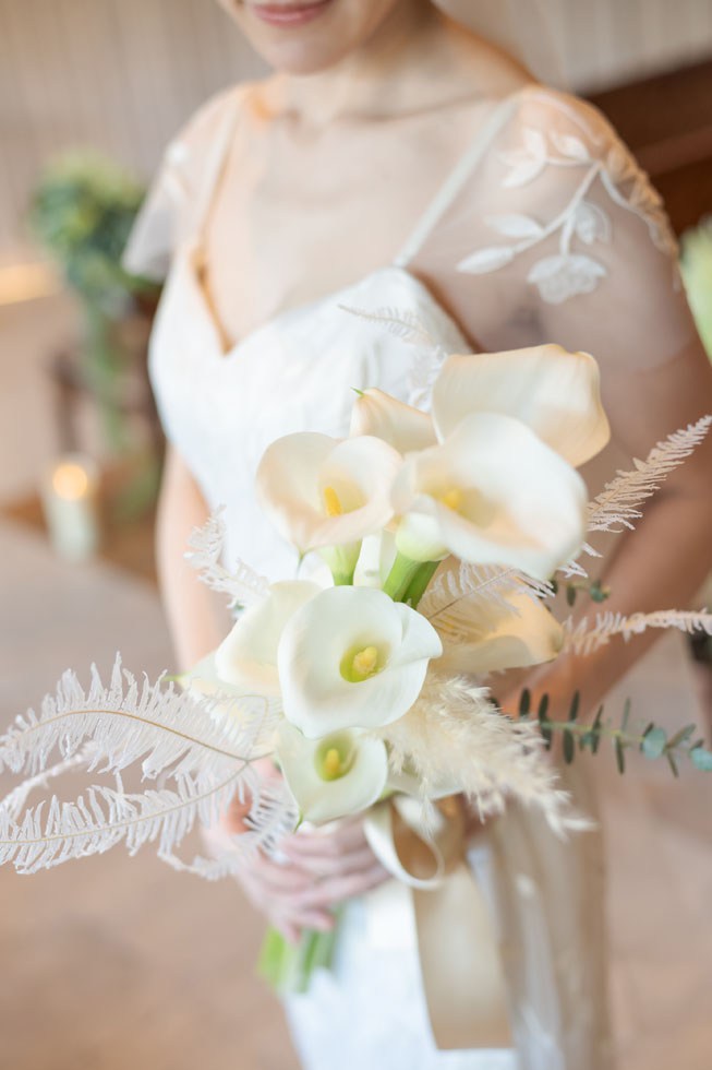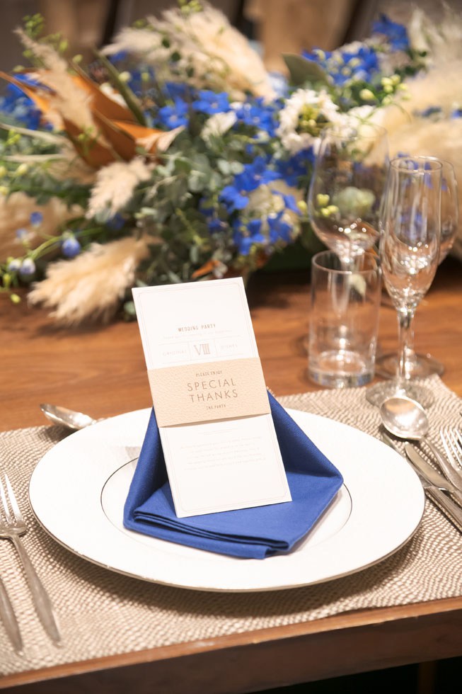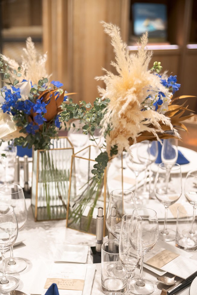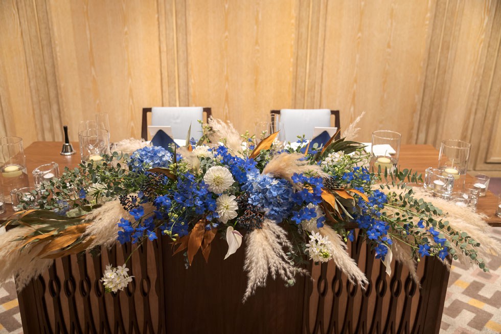 ウェルカムスペースにはお子様とおふたりの軌跡を辿るお写真をあしらったボードがお出迎え。上品なソフトマーメイドのドレスに合わせたホワイトのカラークラッチブーケが洗練さをより引き立たせてくれます。会場装花には秋らしいパンパスグラスにネイビーをアクセントカラ―に追加して大人っぽさを演出。