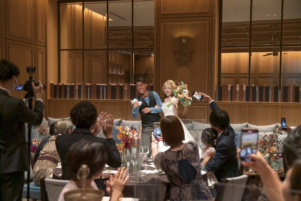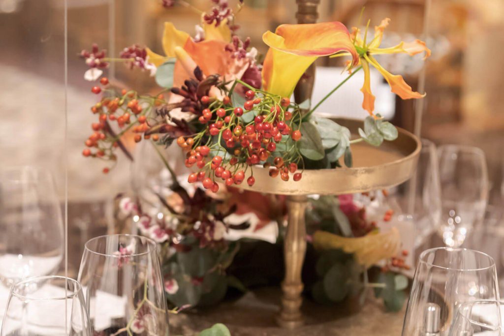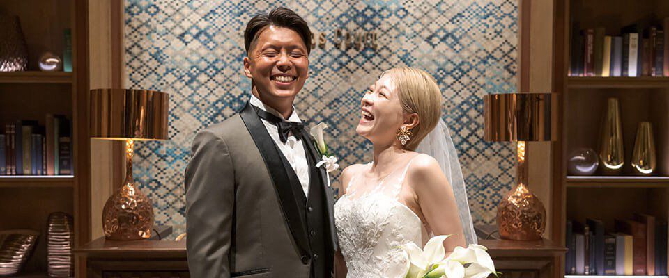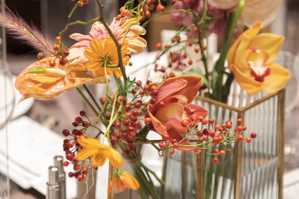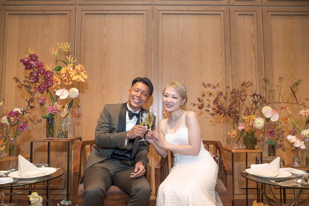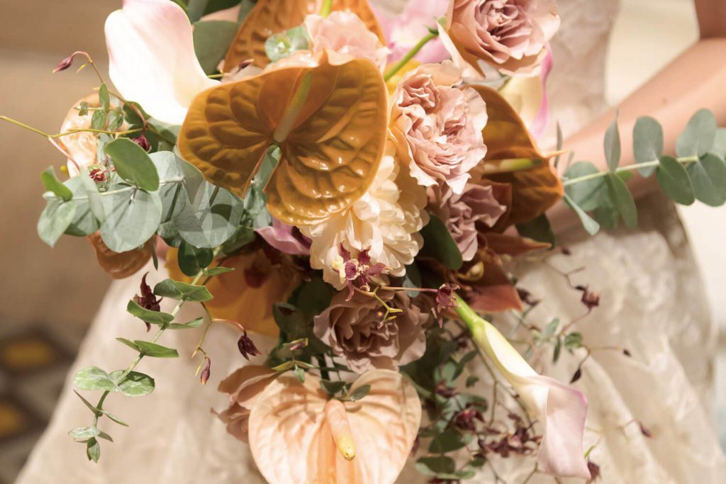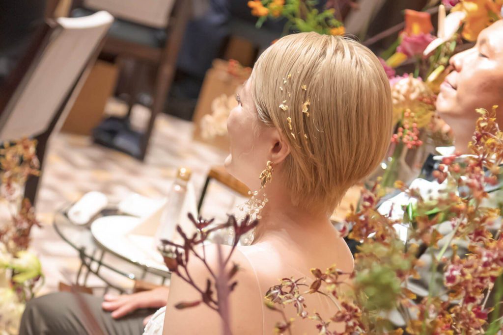 眩しい笑顔にハイトーンのショートヘアがお似合いのご新婦様をご紹介。マーメイドラインのドレスにカラーをシンプルにまとめたブーケが、より洗練された雰囲気を醸し出しています。まずはブエノスコートのホワイエでファーストミートでスタートしたおふたり。ドレス姿をお披露目した瞬間、顔を見合わせながら思わず照れ笑いがこみ上げます。披露宴会場にはゲストとの距離を近くに感じられるよう、人気の高砂ソファでコーディネート。暖色系のお花に赤い実の枝ものを加える事で、初秋の雰囲気も感じられます。再入場ではご新婦様はウェーブをつけてヘアチェンジ。ご新郎様もデニムシャツにオレンジの蝶ネクタイが焼けた肌にとてもよく似合っています。後半はロングソファでゲストとの会話やお写真を楽しみ、ゲスト全員が笑顔になるお時間となりました。