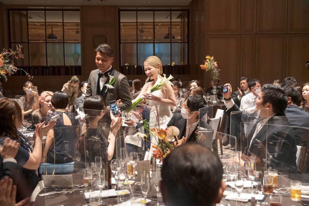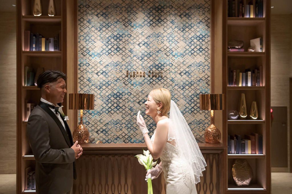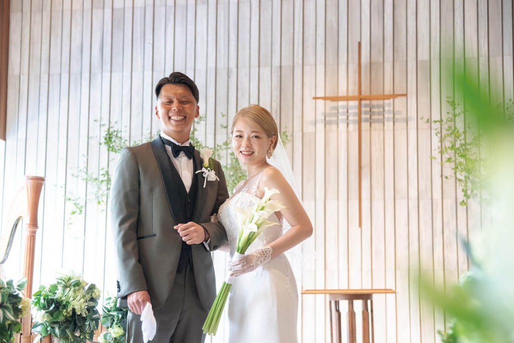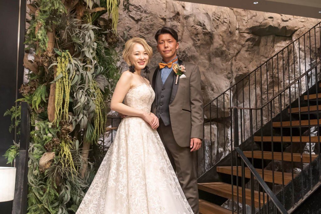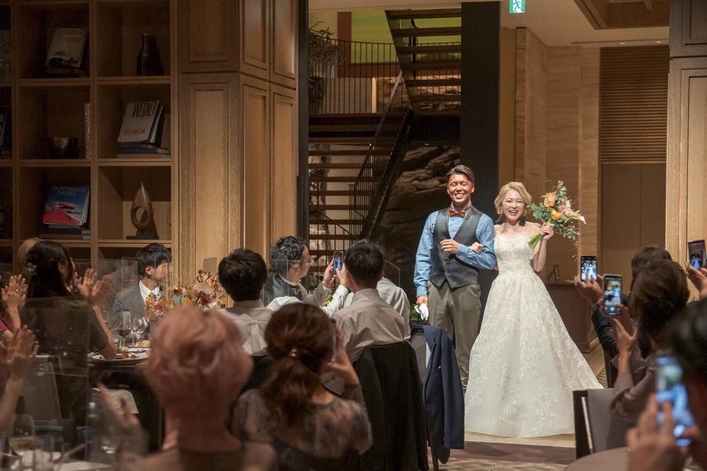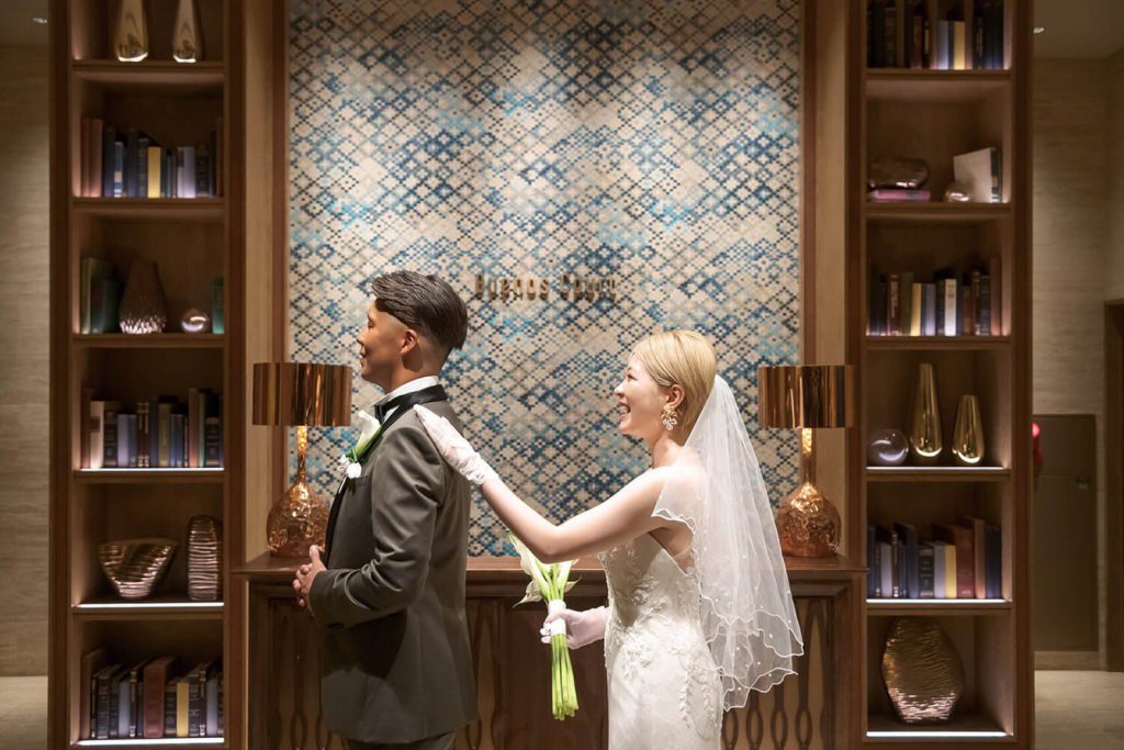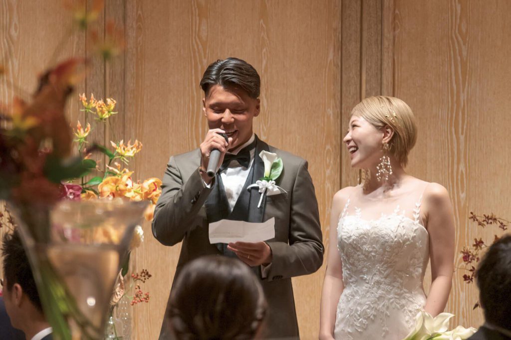 眩しい笑顔にハイトーンのショートヘアがお似合いのご新婦様をご紹介。マーメイドラインのドレスにカラーをシンプルにまとめたブーケが、より洗練された雰囲気を醸し出しています。まずはブエノスコートのホワイエでファーストミートでスタートしたおふたり。ドレス姿をお披露目した瞬間、顔を見合わせながら思わず照れ笑いがこみ上げます。披露宴会場にはゲストとの距離を近くに感じられるよう、人気の高砂ソファでコーディネート。暖色系のお花に赤い実の枝ものを加える事で、初秋の雰囲気も感じられます。再入場ではご新婦様はウェーブをつけてヘアチェンジ。ご新郎様もデニムシャツにオレンジの蝶ネクタイが焼けた肌にとてもよく似合っています。後半はロングソファでゲストとの会話やお写真を楽しみ、ゲスト全員が笑顔になるお時間となりました。