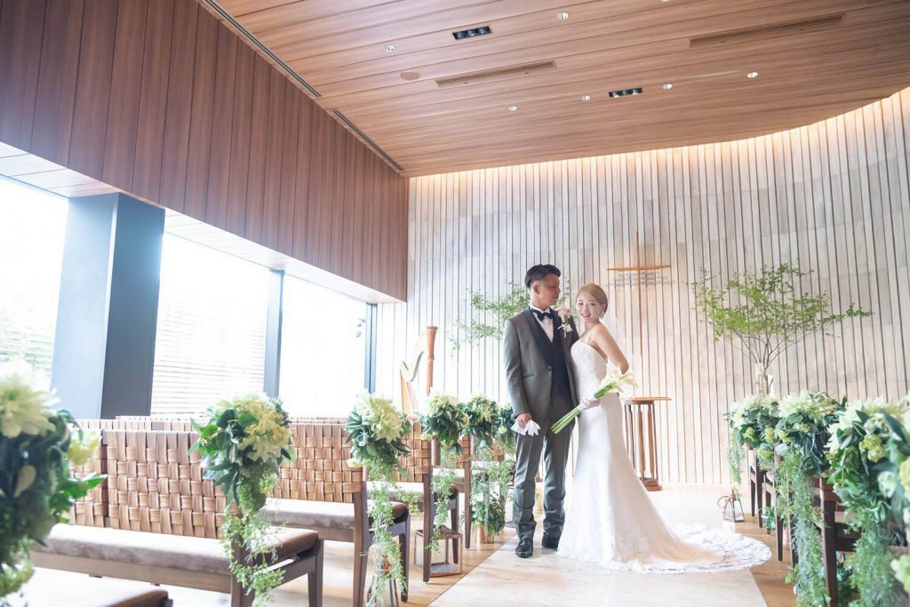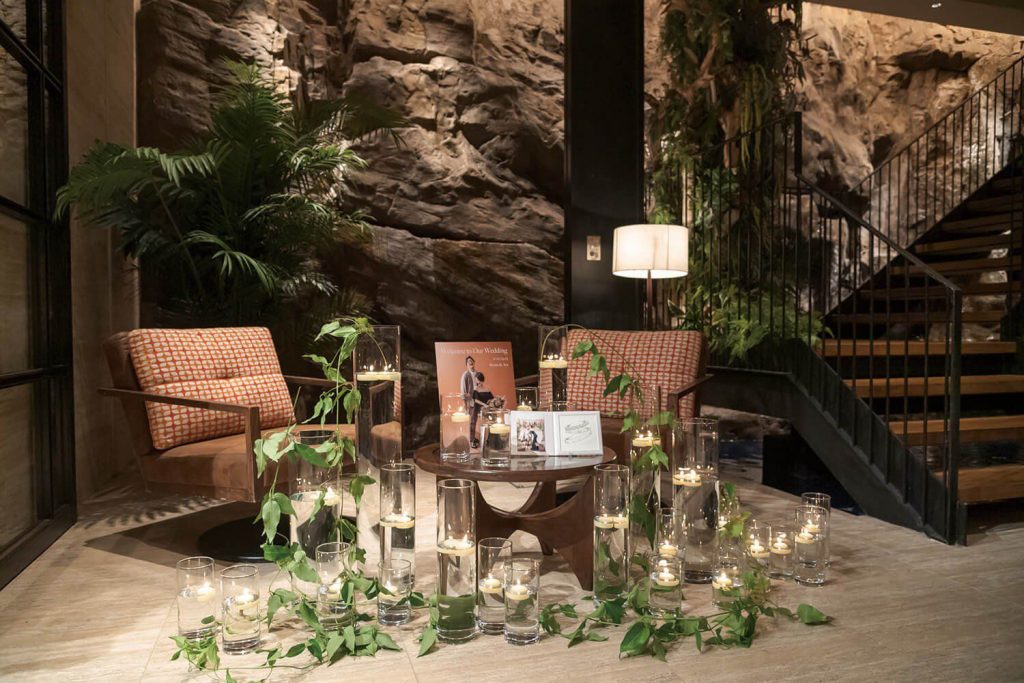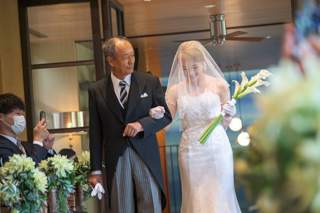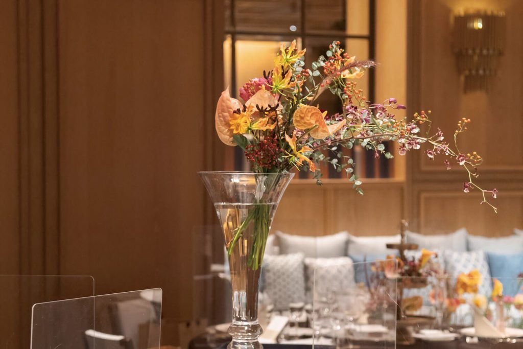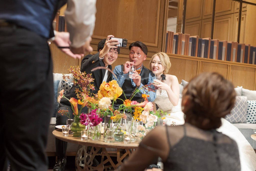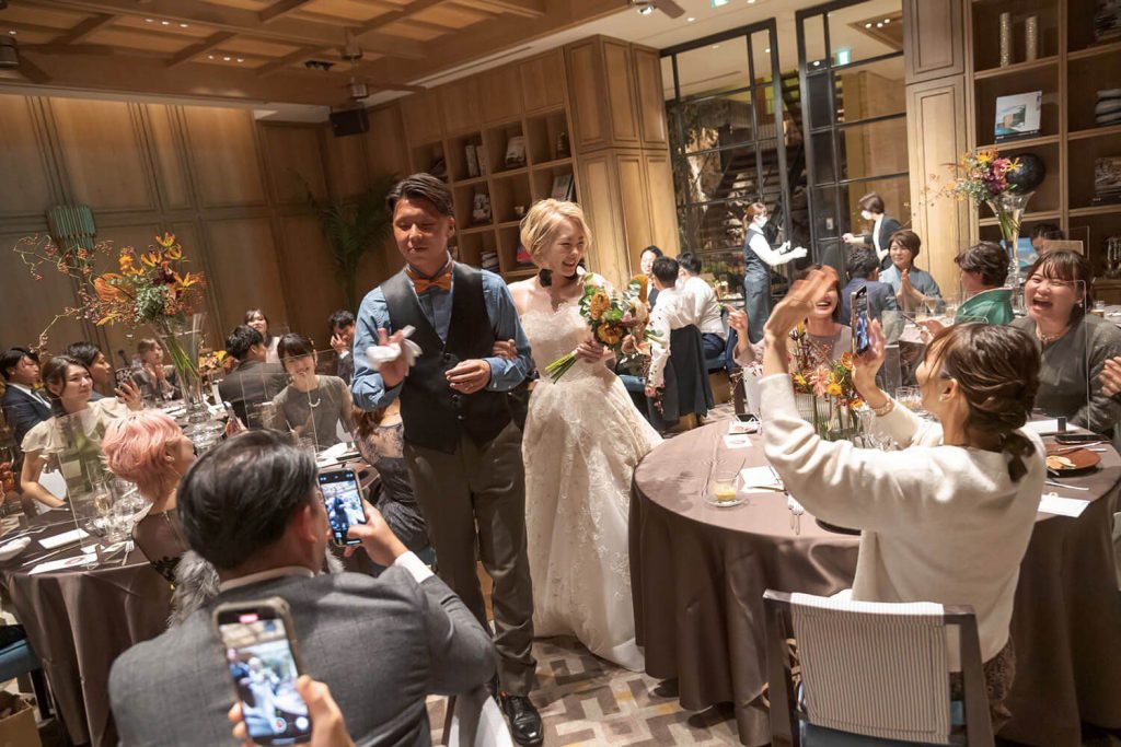 眩しい笑顔にハイトーンのショートヘアがお似合いのご新婦様をご紹介。マーメイドラインのドレスにカラーをシンプルにまとめたブーケが、より洗練された雰囲気を醸し出しています。まずはブエノスコートのホワイエでファーストミートでスタートしたおふたり。ドレス姿をお披露目した瞬間、顔を見合わせながら思わず照れ笑いがこみ上げます。披露宴会場にはゲストとの距離を近くに感じられるよう、人気の高砂ソファでコーディネート。暖色系のお花に赤い実の枝ものを加える事で、初秋の雰囲気も感じられます。再入場ではご新婦様はウェーブをつけてヘアチェンジ。ご新郎様もデニムシャツにオレンジの蝶ネクタイが焼けた肌にとてもよく似合っています。後半はロングソファでゲストとの会話やお写真を楽しみ、ゲスト全員が笑顔になるお時間となりました。