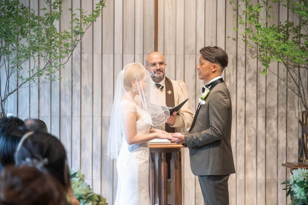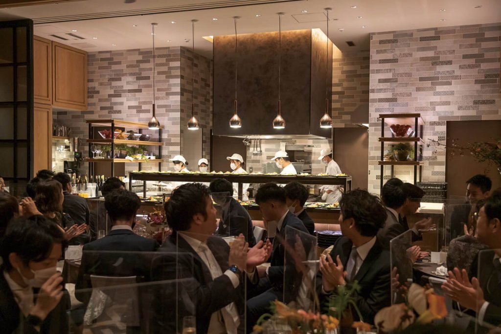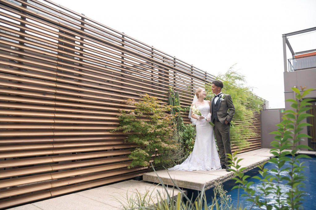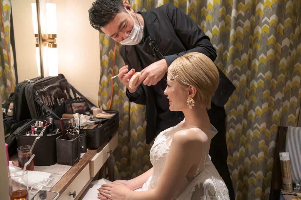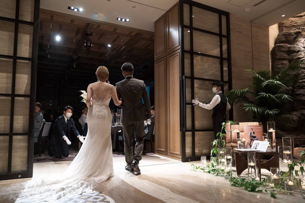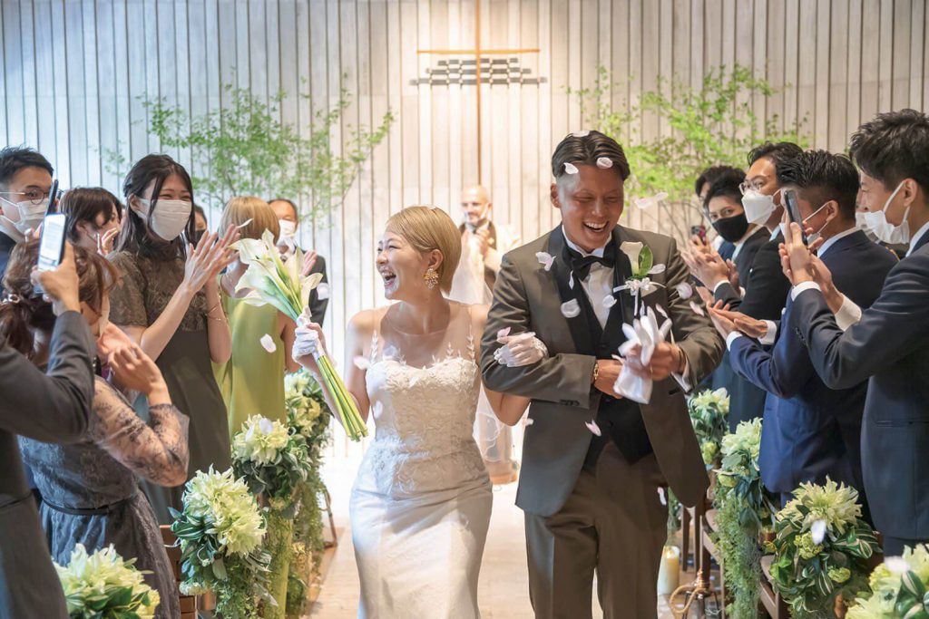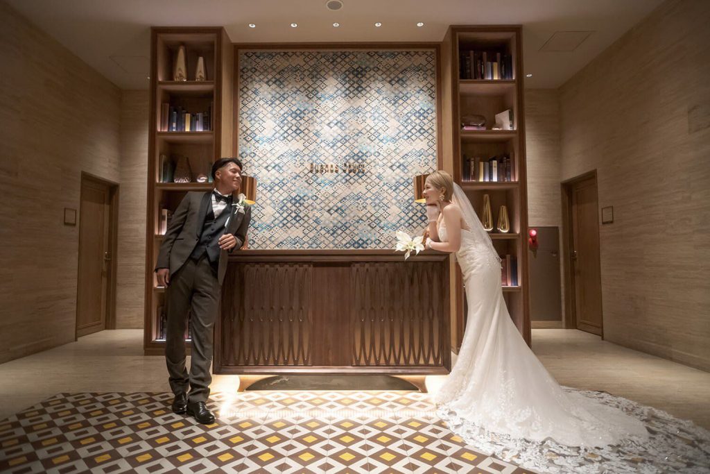 眩しい笑顔にハイトーンのショートヘアがお似合いのご新婦様をご紹介。マーメイドラインのドレスにカラーをシンプルにまとめたブーケが、より洗練された雰囲気を醸し出しています。まずはブエノスコートのホワイエでファーストミートでスタートしたおふたり。ドレス姿をお披露目した瞬間、顔を見合わせながら思わず照れ笑いがこみ上げます。披露宴会場にはゲストとの距離を近くに感じられるよう、人気の高砂ソファでコーディネート。暖色系のお花に赤い実の枝ものを加える事で、初秋の雰囲気も感じられます。再入場ではご新婦様はウェーブをつけてヘアチェンジ。ご新郎様もデニムシャツにオレンジの蝶ネクタイが焼けた肌にとてもよく似合っています。後半はロングソファでゲストとの会話やお写真を楽しみ、ゲスト全員が笑顔になるお時間となりました。